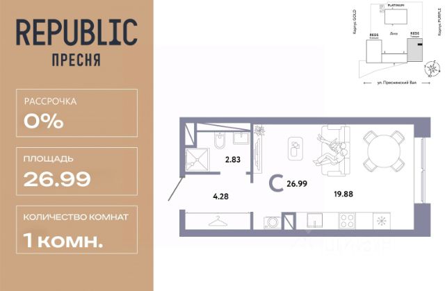 Новая квартира в ЖК "Republic" напрямую от федерального застройщика "Страна Девелопмент". Продается 1комнатная квартира на 5 этаже от застройщика Страна Девелопмент. Площадь квартиры 26,99 кв. м. Дизайн-квартал "Republic" — новый проект премиум-класса в Москве. 10 жилых башен и 4 восстановленных здания локомотивного депо образуют уникальное пространство. "Republic" — место, где вы ощутите гармонию истории и современности. Детский сад, SPA-комплекс с бассейном, гастрономический и шопинг-центры, собственный бульвар и яркие арт-пространства — для жителей предусмотрены все элементы премиального комфорта. Преимущества Уникальная жизненная среда, где инфраструктура включает гастрономию, SPA-комплекс с термами, образовательные и развлекательные заведения, арт-пространство и шопинг-аллеи. Двор от британского бюро "Gillespies": на 4 гектарах закрытого двора расположится 7 игровых зон для разных возрастов с ручьем и сухим фонтаном, арт-галерея под открытым небом и большой прогулочный бульвар. Лобби с террасой в башнях "Reds" — лаконичное пространство галереи-лобби, где можно проводить деловые и дружеские встречи, не нарушая приватности квартиры. В тёплое время года не остаётся пустующей терраса на крыше, которая привлекает непринуждённой атмосферой и прохладительными напитками в баре. Клубная гостиная — стильное пространство оборудовано кухней и залом для торжеств на 40 человек, а для того, чтобы побыть наедине с собой, почитать книгу или провести онлайн-встречу в гостиной оборудована мастерская с библиотекой. Уникальные форматы квартир, где можно реализовать любой жизненный сценарий: от стильного офиса в двухэтажной квартире до угловых лотов с просторными гостиными. А эксклюзивные пентхаусы с высокими потолками и панорамными окнами дарят захватывающие виды на Москву.. Отделка Квартиры сдаются без отделки или в формате White box. При отделке White box уже были выполнены все шумные и грязные работы руками наших специалистов: произведена разводка электричества с установкой подрозетников, установлены откосы из гипсокартона, устроена стяжка пола с шумоизоляцией. Способы покупки Сотрудники "Страна Девелопмент" будут сопровождать вас на каждом этапе сделки, помогут получить одобрение по ипотеке или снизить ежемесячный платеж. - ипотека - рассрочка - с использованием материнского капитала - 100% оплата наличными