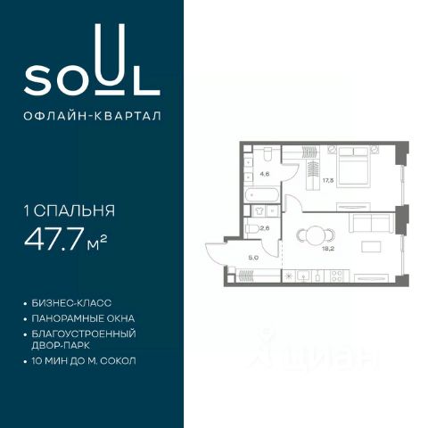 Цены указаны с условием 100% оплаты и стандартной ипотеки. Прямая продажа от застройщика! Продается 1-к. квартира номер 25 общей площадью 46.9 кв.м. на 5-м этаже 9 этажного дома, корпус UNIQUE (премиум-класс). Без отделки. Проект бизнес-класса SOUL от девелопера FORMA. До метро Сокол 10 мин пешком. Архитектура от британского бюро SimpsonHaugh. Благоустройство дворов — Gillespies и GAFA. Территория состоит из культурного парка и приватных дворов. Озеленение в эстетике лесного оазиса. Насыщенное благоустройство: прогулочные тропинки, релакс-зоны, пряный и сенсорный сады, развивающие детские площадки и воркауты. В центре проекта объект культурного наследия — общественное пространство Изофабрика, построенная в 30-х годах по проекту архитектора Георгия Гольца. Здесь будут располагаться мастерские для взрослых и детей, выставочные залы, коворкинги, образовательный центр, рестораны и кафе. Квартиры с панорамными окнами, мастер-спальнями, гардеробными, классическими балконами и лоджиями, видовыми террасами. Высота потолков от 2,9 до 3,5 м. В проекте 2 детских сада на 100 и 200 малышей. Клубная гостиная, фитнес-рум, детская игровая комната, дизайнерские лобби, подземный паркинг и келлеры.
