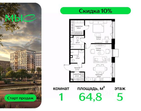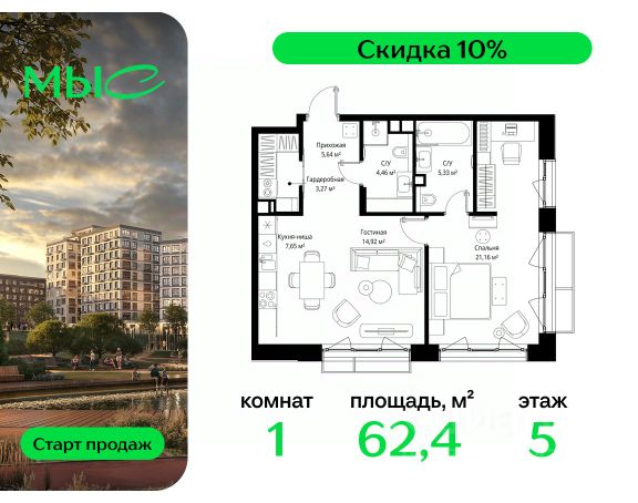 Прямая продажа от застройщика. Продаётся 1-комнатная квартира общей площадью 62.43 м² без отделки в премиальном жилом комплексе "МЫС" на 5-м этаже 12 этажного дома. Квартира расположена в корпусе "Волга". Проект МЫС — это, прежде всего, идеальное место для семей. В рамках проекта построят государственную школу, два детских сада и дворец спорта площадью 20 000 м2 с термальным комплексом, выплывным бассейном, фитнес-залом, теннисными, сквош и падел кортами и секциями для детей. На территории площадью, сравнимой с тремя парками Зарядье, появятся кафе и рестораны, пруд с набережной, спортивные и детские площадки, скейт-парк, лыжные и веломаршруты. Расположение: - 2 минуты до скоростной трассы М1 и Минского шоссе; - 10 минут до МКАД; - 15 минут до МЦД Лесной Городок - 20 минут до делового центра "Москва-Сити"; - 28 минут до аэропорта "Внуково". Благоустройство: - велосипедные и лыжные маршруты; - собственная набережная и парк; - лаунж-зоны в окружении природы; - беседки у очага; - дворец спорта площадью 20 000 м²; - термальный комплекс с тремя бассейнами; - 4 теннисных и падел-корта; - 6 сквош-кортов; - многофункциональный спортзал; - скейт-парк; - просторная площадь для прогулок с фонтаном; - детский клуб с творческими секциями; - гастро-доминанта; - кафе у пруда, рестораны, ритейл. Окружение - соседство с лесным фондом; - школа на 1250 мест и 2 детских сада на 350 и 255 мест; - Дубковский и Подушкинский леса, парк "Рассказовка", Мещерский парк. Действуют специальные условия при 100% оплате, подробности уточняйте у менеджера в офисе продаж.