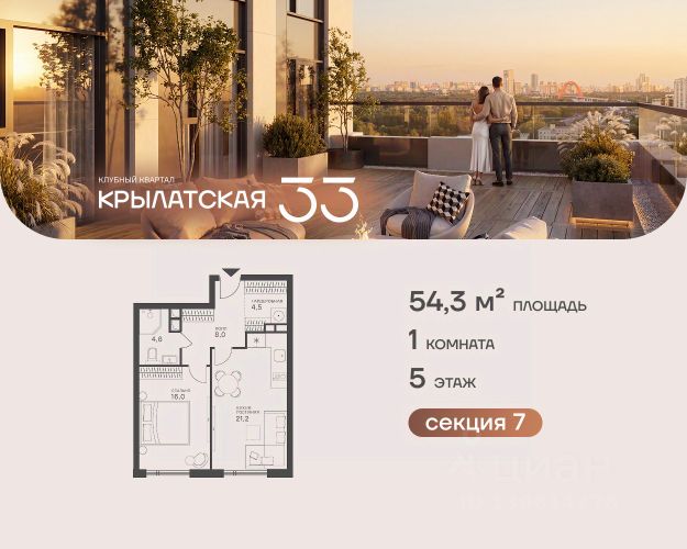 Продается 1-к квартира площадью 61 кв.м. на 5-м этаже в ЖК "Клубный квартал Крылатская 33". Прямая продажа от застройщика! Крылатская 33 - проект премиум-класса на западе Москвы от специализированного застройщика "Сияние". Комплекс расположен всего в 15 минутах от Садового кольца и Москва-Сити, а рядом есть большое количество зелёных зон: Крылатский и Москворецкий парки, Серебряный бор, Крылатские холмы - это создает идеальный баланс между приватностью и динамичным ритмом мегаполиса. Квартал сочетает высотные башни до 150 метров и камерные малоэтажные корпуса. Витражное остекление "в пол" наполняет квартиры светом и открывает захватывающие панорамы на Москву-реку и знаковые виды столицы. Здесь каждый найдет то, что подходит именно ему - от уютных студий до роскошных пентхаусов и квартир с собственными террасами. Внутренняя среда жилого комплекса продумана до мельчайших деталей, чтобы резиденты могли продуктивно работать и качественно отдыхать, не покидая территорию: • фитнес-центр, включающий в себя СПА-зону; • коворкинг с кофейней и быстрым интернетом; • общественная гостиная для организации клубных мероприятий; • ресторан с панорамным остеклением; • благоустроенный сад с зоной отдыха; • инновационная игровая площадка для детей всех возрастов; • консьерж-сервис 24/7, современные системы видеонаблюдения и пожаротушения; • двухуровневый паркинг и многое другое. Район Крылатское - точка притяжения для тех, кто выбирает активный образ жизни. В непосредственной близости расположены Гребной канал, Олимпийский велотрек, горнолыжный комплекс "Лата Трэк", гольф-клуб и парковые зоны. В проекте действуют привлекательные условия покупки: - выгода до 10% при 100% оплате (действует на ограниченный пул квартир, подробности уточняйте в отделе продаж). - рассрочка от застройщика 0% с первоначальным взносом от 20% на срок до 30.06.2027.