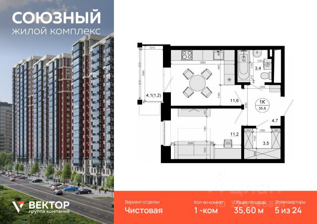 Продается 1-комн. квартира площадью 35,6 кв.м на 5 этаже 24 этажного дома в ЖК "Союзный" от федерального девелопера ГК "Вектор". Расположение, транспортная доступность Жилой комплекс "Союзный" — это квартал из 6 монолитных домов комфорт-класса высотой до 25 этажей, строящийся в 8-ом микрорайоне города Одинцово на улице Маковского. В продаже квартиры площадью от 37,2 до 88 кв. м, с потолками высотой 2,7 м, лоджиями, 2-мя санузлами в квартирах с 3-мя комнатами. Квартиры без отделки и с отделкой эконом, бизнес или комфорт класса. Квартал располагается на территории с отличной транспортной доступностью: - 8 км от МКАД; - 15 минут пешком до станции "Одинцово" МЦД-1; - рядом находится автобусная остановка, от которой можно доехать до метро "Парк Победы", "Киевская", "Юго-Западная"; На личном автотранспорте доехать от комплекса по Минскому шоссе к новой развязке с МКАД можно примерно за 20 минут. В качестве альтернативы можно выбрать Можайское шоссе. Даже в час пик передвигаться по нему можно со скоростью 50 км/ч. Кроме того, можно выбрать платную трассу Северный обход Одинцово. Путь от квартала до Северо-Западной хорды на автомобиле займет 25-35 минут, а до ТТК и Садового кольца - 1 час. В квартале запланировано строительство торгового центра, детского сада на 245 мест (сдача - 4 кв 2025 г.), многоуровневой открытой стоянки на 257 автомобилей, многоуровневого подземного паркинга, наземно-подземного паркинга с эксплуатируемой кровлей и других объектов. На внутренней территории квартала разместятся детский игровой комплекс с резиновым покрытием, спортплощадка, зоны отдыха для взрослых, деревья, кустарники и газоны. В шаговой доступности от ЖК "Союзный" располагаются школа, детский сад, профучилище, несколько ТЦ, кинотеатр "Юность", Ледовый дворец, сквер Союзный, Глазынинский пруд с качелями и площадкой для хоккея. В районе ЖК нет промышленных производств, а совсем близко начинаются лесные массивы, занимающие площадь свыше 70 000 га. Этот район считается одним из самых экологически чистых в Подмосковье.*