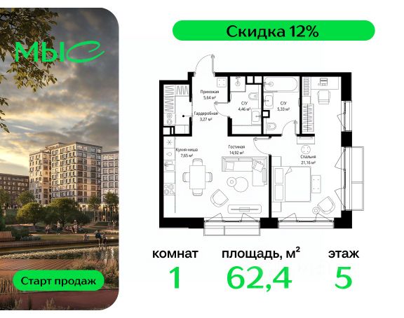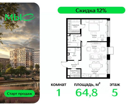 Прямая продажа от застройщика. Продаётся 1-комнатная квартира общей площадью 43.70 м² без отделки в премиальном жилом комплексе "МЫС" на 5-м этаже 12 этажного дома. Проект МЫС — это, прежде всего, идеальное место для семей. В рамках проекта построят государственную школу, два детских сада и дворец спорта площадью 20 000 м2 с термальным комплексом, выплывным бассейном, фитнес-залом, теннисными, сквош и падел кортами и секциями для детей. На территории площадью, сравнимой с тремя парками Зарядье, появятся кафе и рестораны, пруд с набережной, спортивные и детские площадки, скейт-парк, лыжные и веломаршруты. Расположение: - 2 минуты до скоростной трассы М1 и Минского шоссе; - 10 минут до МКАД; - 15 минут до МЦД Лесной Городок - 20 минут до делового центра "Москва-Сити"; - 28 минут до аэропорта "Внуково". Благоустройство: - велосипедные и лыжные маршруты; - собственная набережная и парк; - лаунж-зоны в окружении природы; - беседки у очага; - дворец спорта площадью 20 000 м²; - термальный комплекс с тремя бассейнами; - 4 теннисных и падел-корта; - 6 сквош-кортов; - многофункциональный спортзал; - скейт-парк; - просторная площадь для прогулок с фонтаном; - детский Клуб с творческими секциями; - гастро-доминанта; - кафе у пруда, рестораны, ритейл. Окружение - соседство с лесным фондом; - школа на 1250 мест и 2 детских сада на 350 и 255 мест; - Дубковский и Подушкинский леса, парк "Рассказовка", Мещерский парк. Действуют специальные условия при 100% оплате, подробности уточняйте у менеджера в офисе продаж.