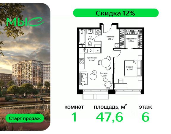 Прямая продажа от застройщика. Продаётся 1-комнатная квартира общей площадью 47.64 м² без отделки в премиальном жилом комплексе "МЫС" на 6-м этаже 12 этажного дома. Проект МЫС — это, прежде всего, идеальное место для семей. В рамках проекта построят государственную школу, два детских сада и дворец спорта площадью 20 000 м2 с термальным комплексом, выплывным бассейном, фитнес-залом, теннисными, сквош и падел кортами и секциями для детей. На территории площадью, сравнимой с тремя парками Зарядье, появятся кафе и рестораны, пруд с набережной, спортивные и детские площадки, скейт-парк, лыжные и веломаршруты. Расположение: - 2 минуты до скоростной трассы М1 и Минского шоссе; - 10 минут до МКАД; - 15 минут до МЦД Лесной Городок - 20 минут до делового центра "Москва-Сити"; - 28 минут до аэропорта "Внуково". Благоустройство: - велосипедные и лыжные маршруты; - собственная набережная и парк; - лаунж-зоны в окружении природы; - беседки у очага; - дворец спорта площадью 20 000 м²; - термальный комплекс с тремя бассейнами; - 4 теннисных и падел-корта; - 6 сквош-кортов; - многофункциональный спортзал; - скейт-парк; - просторная площадь для прогулок с фонтаном; - детский Клуб с творческими секциями; - гастро-доминанта; - кафе у пруда, рестораны, ритейл. Окружение - соседство с лесным фондом; - школа на 1250 мест и 2 детских сада на 350 и 255 мест; - Дубковский и Подушкинский леса, парк "Рассказовка", Мещерский парк. Действуют специальные условия при 100% оплате, подробности уточняйте у менеджера в офисе продаж.