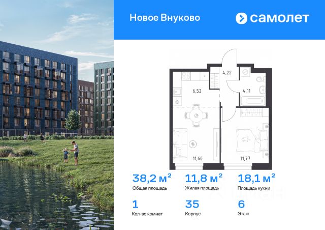 Предлагается 1-комнатная квартира комфорт-класса 35,79 кв.м в корпусе 32 на 6 этаже, в ЖК "Новое Внуково" Квартира без отделки. Доступность опции "отделка" и возможность комплектации мебелью и декором уточняйте у застройщика. Приобрести квартиру возможно по специальным акциям от застройщика, с текущими условиями акций можно ознакомиться в блоке "Акций". Цена динамическая и может отличаться, уточняйте актуальность у застройщика. "Новое Внуково" — это жилой комплекс в Новой Москве, у подножия берега реки Незнайка. Поблизости — живописные места для прогулок: народный парк "Ручеек", усадьба Старо-Никольское, Валуевский и Ульяновский лесопарки. Часть домов сдана и внутри района уже открыт детсад с бассейном, а в ближайшее время откроются еще 3 детсада, 2 школы и поликлиника. На территории проекта будет построен первый в России Центр Российской Федерации Баскетбола, где будут площадки с трибунами, тренажерный зал, кафе и конференц-зал. Дворы-парки закрыты от машин и посторонних. На территории — прогулочный маршрут вдоль реки Незнайка и набережная с шезлонгами и качелями для отдыха. Также здесь появится плейхаб "Незнайка на Луне", площадь для мероприятий с сухим фонтаном, летним кинотеатром и кафе. В жилом комплексе — монолитные дома высотой от 6 до 14 этажей. Фасады облицованы кирпичом природных оттенков.