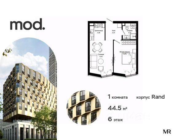 Прямая продажа от застройщика. Дизайнерская отделка MR Ready. Продается 1-комнатная квартира общей площадью 58.58 м² с чистовой отделкой в ЖК Mod на 6-м этаже 9 этажного клубного дома. Mod - жилой комплекс премиум-класса в историческом районе Москвы Марьина Роща, состоящий из трех клубных домов (9 этажей) и трёх разноэтажных башен (44-55 этажей). Корпус Mod.S (9 этажей) В отделке клубного дома используется бронза, алюминий и камень. Благодаря сложной архитектуре и грамотному смешению материалов рождается неповторимый динамичный ансамбль. Закрытая территория жилого комплекса, продуманное благоустройство, эксплуатируемые кровли стилобата, образовательный центр с детским садом создают приватное пространство для тихой семейной жизни, а городская площадь с фонтанами, ресторан, супермаркет, коммерческая инфраструктура на первых этажах привносят созвучную с ритмом города динамику. Преимущества проекта: - В шаговой доступности новый деловой кластер Москвы - Выразительная авторская архитектура - Единственные в Москве фасады башен из натурального камня - Панорамное остекление и высота потолков до 4,8 м - Квартиры и апартаменты с отделкой MR Base - Многоуровневое благоустройство с зонированием на закрытой территории - Многофункциональный образовательный детский центр с детским садом - Двухуровневый подземный паркинг Транспортная доступность: - 5 минут пешком до станции метро "Марьина Роща" - 3 минуты до ТТК - 15 минут до Цветного бульвара Компания MR предлагает своим клиентам специальные условия приобретения квартир в рамках программ ипотечного кредитования от банков-партнеров.