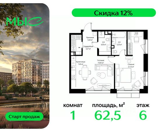 Прямая продажа от застройщика. Продаётся 1-комнатная квартира общей площадью 44.98 м² без отделки в премиальном жилом комплексе "МЫС" на 6-м этаже 12 этажного дома. Квартира расположена в корпусе "Волга". Проект МЫС — это, прежде всего, идеальное место для семей. В рамках проекта построят государственную школу, два детских сада и дворец спорта площадью 20 000 м2 с термальным комплексом, выплывным бассейном, фитнес-залом, теннисными, сквош и падел кортами и секциями для детей. На территории площадью, сравнимой с тремя парками Зарядье, появятся кафе и рестораны, пруд с набережной, спортивные и детские площадки, скейт-парк, лыжные и веломаршруты. Расположение: - 2 минуты до скоростной трассы М1 и Минского шоссе; - 10 минут до МКАД; - 15 минут до МЦД Лесной Городок - 20 минут до делового центра "Москва-Сити"; - 28 минут до аэропорта "Внуково". Благоустройство: - велосипедные и лыжные маршруты; - собственная набережная и парк; - лаунж-зоны в окружении природы; - беседки у очага; - дворец спорта площадью 20 000 м²; - термальный комплекс с тремя бассейнами; - 4 теннисных и падел-корта; - 6 сквош-кортов; - многофункциональный спортзал; - скейт-парк; - просторная площадь для прогулок с фонтаном; - детский Клуб с творческими секциями; - гастро-доминанта; - кафе у пруда, рестораны, ритейл. Окружение - соседство с лесным фондом; - школа на 1250 мест и 2 детских сада на 350 и 255 мест; - Дубковский и Подушкинский леса, парк "Рассказовка", Мещерский парк. Действуют специальные условия при 100% оплате, подробности уточняйте у менеджера в офисе продаж.