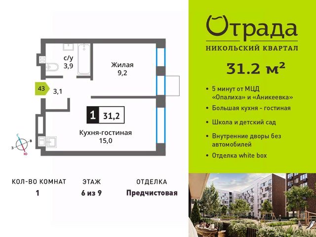 Цена указана с учётом скидки при 100%-й оплате, несубсидированной ипотеке, рассрочке (кроме программы "Рассрочка 0%"). В районе, утопающем в густой зелени лесов, многочисленных парков и скверов, продаётся 1-комнатная квартира площадью 36.70 кв.м без отделки. Квартира расположена на 6 этаже в жилом комплексе комфорт-класса Левел Лесной (компания Level Group/Левел групп). Жилой квартал Левел Лесной расположен в посёлке Отрадное Красногорского района Московской области. Это уникальный природный уголок вблизи района Митино. Посёлок окружён обширными лесными массивами. Обилие зелени создаёт благоприятный экологический фон и превращает этот район в оазис спокойствия и единения с природой. Расположение и инфраструктура: - Район окружен роскошной зеленью лесов и парковых зон, занимающих территорию свыше 1 000 гектаров, среди них лесопарк внутри жилого комплекса, загородный парк "Отрада", Митинский лесопарк, набережная реки Синички. - Идеальные условия для активного отдыха в любое время года: пешие и велопрогулки, бег, зимой - лыжи и катание на ватрушках. - На территории ЖК - частная школа "Светлые Горы", входящая в топ лучших школ Москвы и Подмосковья (Forbes Education, 2023), и детский сад, в пешей доступности расположены 9 детских садов. - На территории жилого комплекса - сетевые супермаркеты, локальные магазины, аптеки, салоны красоты, рестораны и другие объекты инфраструктуры в сданных корпусах. В 12 мин. пешком - крупный торговый парк "Отрада" с гипермаркетами, кинотеатром и детскими развлечениями. Отличная транспортная доступность: - 25 мин. пешком до станции метро "Пятницкое шоссе"; - 28 мин. на автобусе до станции метро и МЦД-2 "Волоколамская"; - 11 мин. на авто до МКАД; - 25 мин. на авто до ТТК. Продуманный архитектурный проект: - Концепция проекта Левел Лесной разработана бюро СПИЧ; - Высотность комплекса до 15 этажей с уникальными видами на лесные массивы и город; - Высота потолков до 3 м; - Современные окна высотой до 1,6 м, в части квартир предусмотрены окна в пол. Высота подоконников 0,6 м. Благоустройство: Продуманное пространство и аура приватного европейского городка рождают чувство лёгкости и расслабления у каждого, кто попадает на территорию проекта. Концепцию общественных площадок разработали в партнёрстве два архитектурных бюро: Highlight Architecture и SCAPE. В безопасных дворах без машин каждый обязательно найдёт себе место для вдохновения, отдыха и спорта.