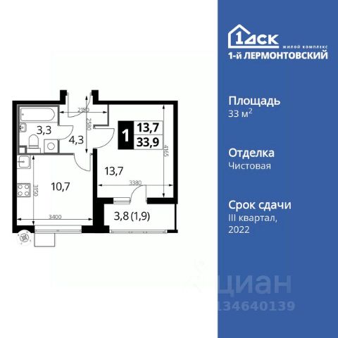 Прямая продажа от застройщика! Жилой Комплекс класса Комфорт Плюс. Продаётся 1-к квартира номер 738 общей площадью 33.9 кв.м. на 6-м этаже 25 этажного дома. Чистовая отделка. Особенности квартиры: - Просторная спальня, в которой можно разместить большую кровать. - Линейная планировка - максимальная функциональность и удобство. - Линейная кухня - функциональность и практичность в одном решении. - Ниша под шкаф - компактное и удобное место для вещей. - Лоджия - уютное место для отдыха и тишины. Информация о комплексе: Ощущение уютного дома должно начинаться с подъезда. Мы постарались предусмотреть все нюансы, чтобы наши лифты отвечали самым строгим современным требованиям. Двор без машин, закрытое, безопасное, охраняемое место с удобным доступом для вашего авто, более чистый воздух и гарантированное место для стоянки - и это далеко не преимущества наличия подземного паркинга. А наличие кладовых позволит вам поддерживать идеальный порядок и уют в вашей квартире! "1-й Лермонтовский" расположился недалеко от уже сложившегося зеленого окружения - Люберецкого парка и Жулебинского лесопарка, переходящего в природно - исторический парк "Кузьминки". Если вы предпочитаете активный семейный отдых на свежем воздухе - в округе мест для него предостаточно. С востока он граничит со столичным районом Некрасовка. С северной стороны - с развитым современным микрорайоном "Красная Горка". Удачное расположение дарит жильцам возможность передвижения как на своем автомобиле, так и на общественном транспорте. Транспортная доступность: В шаговой доступности ж/д станция "Люберцы-1". 5 минут на автомобиле до станций метро "Некрасовка", "Котельники", "Лермонтовский проспект" Внутренняя инфраструктура: Свободно перемещайтесь по внутренней территории в безбарьерной среде! На территории комплекса созданы все условия как для активного образа жизни, так и для спокойного времяпрепровождения: - игровые площадки для детей разного возраста. - площадки воркаута, спортивные комплексы с зонами для детского и взрослого спорта. - зоны отдыха с пешеходными дорожками и аллеями. Также, к вашим услугам: 4 общеобразовательные школы, 7 детских садов, спортивные и танцевальные, школы, поликлиники, множество магазинов и супер-маркетов, включая Ашан и несколько крупных ТЦ в шаговой доступности.