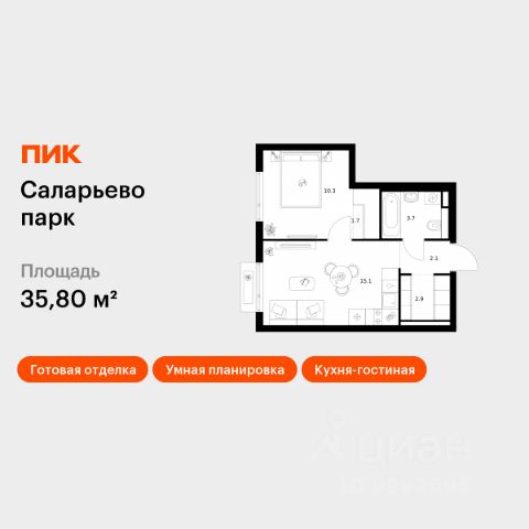 Продаётся 1-комн. квартира площадью 34,6 кв.м на 6 этаже 16 этажного дома (Корпус 57.1, Секция 1) проекта ПИК Саларьево парк. Светлый просторный подъезд на уровне земли, функциональная планировка, большие окна, предчистовая отделка. Жилой район "Саларьево парк" расположен в Новой Москве, в четырёх километрах от МКАД по Киевскому шоссе. Две станции метро: "Саларьево" и "Филатов луг", — находятся в пешей доступности от проекта. Дойти до них можно за 510 минут. В квартале уже создана качественная среда, где есть абсолютно всё для полноценной жизни, работы и отдыха. Благодаря удобному расположению проекта всё важное будет рядом: детские сады, школы, кафе и рестораны, шопинг в торговых центрах, фитнес и даже аэропорт. Все корпуса в квартале гармонично сочетаются, образуя единую городскую среду. Между собой их объединяет невысокая этажность и натуральная цветовая гамма. Здесь приятно гулять и проводить время на улице всей семьёй. В "Саларьево парке" создана уникальная образовательная среда, включающая в себя шесть школ, рассчитанных на 6 250 учеников. Две из них уже открыты, их посещает 2 300 детей. Также на территории "Саларьево парка" находится 12 детских садов, один из которых с бассейном. Сейчас уже открыты 7 садов. В "Саларьево парке" открыта уникальная игровая площадка — PlayHub "Оригами". Здесь есть ручей, горка-труба и рельефные холмы. Взрослые смогут отдохнуть в уютном кафе, пока дети играют. Также на территории проекта есть SportHub — большая спортивная зона, разделённая по интересам и возрастам. Здесь можно заниматься разными видами спорта: футболом, баскетболом, волейболом и стритболом. Зимой центральную часть площадки превращают в каток. Во дворах-парках жилого квартала есть места для отдыха, детские и спортивные площадки. На первых этажах домов расположены магазины, кафе и полезные сервисы. Также вблизи проекта есть несколько масштабных торговых центров. До ТЦ "Саларис" пять минут пешком, до "Рио", Metro Cash & Carry и "Леруа Мерлен" — пять минут на автомобиле. Артикул 1019094 (Застройщик ООО "Специализированный Застройщик "Тирон")