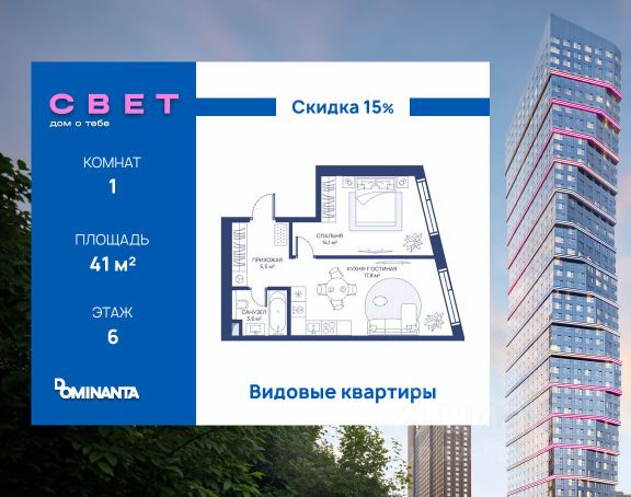 Продаётся 1-к квартира 41 кв.м. на 6-м этаже 51 этажного дома. Без отделки. Срок сдачи: 1 кв. 2028 г. Жилой комплекс "СВЕТ" — воплощение современного комфорта и архитектурного изящества, созданное девелопером Dominanta в сотрудничестве с известным бюро СПИЧ. Комплекс представляет собой элегантное 52-этажное здание, расположенное в Западном Дегунино, на Дмитровском шоссе, 83А. Удачное местоположение обеспечивает удобство для жителей: станция метро "Селигерская" находится в пешей доступности, что делает путь в центр Москвы быстрым и комфортным. Транспортная доступность: - 5 минут пешком до станции метро "Селигерская" - 15 минут на машине до ТТК - 16 минут на транспорте до станции МЦД "Моссельмаш" Квартиры бизнес-класса в ЖК "СВЕТ" сочетают функциональность и эстетическое совершенство. Панорамные окна наполняют жилые пространства естественным светом и открывают захватывающие виды на мегаполис. Каждый житель дома получит доступ к бесплатной клубной инфраструктер SocialHUB. Для бизнес-задач и запуска личных проектов хоум-офис c рабочими станциями, переговорными и креативной студией. Для отдыха и формирования новых социальных связей ивент-пространство, которое подойдет для вечеринки, кинопоказа или паблик-тока. Для новых побед зоны для занятия киберспортом. И главное SocialHUB полностью бесплатен для жителей, все расходы на его содержание покрываются застройщиком. Территория проекта "СВЕТ" включает несколько сценарных зон: ландшафтный парк с шаговой тропой, спортивная зона, открытый амфитеатр, двухуровневая детская площадка, уличные рабочие станции и беседки для отдыха. Сложный рельеф с искусственными холмами и живыми изгородям позволяет эффективно разделить пространство на активные зоны и уединённые "кабинеты" для работы, отдыха или медитации. В ЖК "СВЕТ" каждый найдет арену для своей энергии. Для любителей динамичных игр — павильон для падел (модного микса тенниса и сквоша). Рядом — площадка для стритбола и столы для пинг-понга, где можно устроить соседский турнир! И, конечно, абсолютный мастхэв — зона воркаут для функциональных тренировок под открытым небом. У входа в жилой комплекс гостей встречается арт-объект, разработанный Студией Артемия Лебедева. Его мягкий, волнообразный силуэт напоминает разлитый свет. С заходом солнца арт-объект оживает благодаря светоотражающим материалам его форма становится динамичной и задает настроение всему пространству.