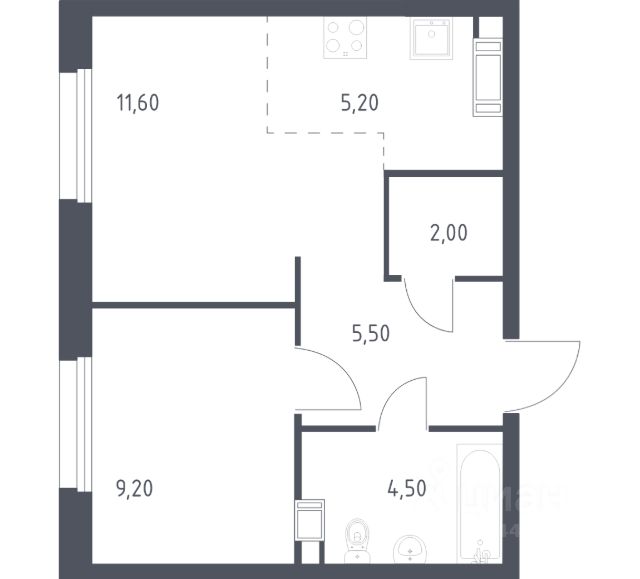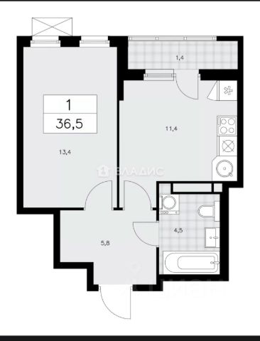 Общая площадь составляет 42.1 кв. метра (+ лоджия 3 кв метра, расположенная на кухне).