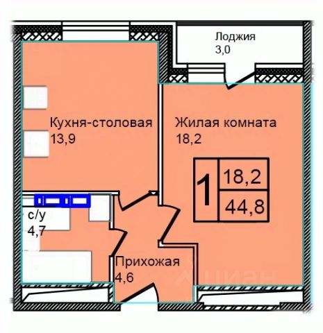 Продаётся 1-комнатная квартира в строящемся доме (Корпус 1), срок сдачи: IV-кв. 2027, общей площадью 44.9 кв.м., на 6 этаже.
