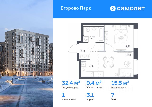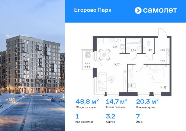 Общая площадь: 35.60 м.кв., Жилая площадь: 17.00 м.кв., Площадь кухни: 10.40 м.кв.