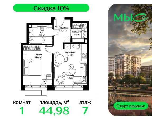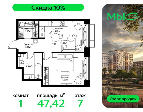 Прямая продажа от застройщика. Продаётся 1-к квартира общей площадью 62.47 м² без отделки в премиальном жилом комплексе "МЫС" на 7-м этаже 12 этажного дома. Квартира расположена в корпусе "Сибирь". ЖК "МЫС" - идеальное место для тех, кто хочет объединить городскую жизнь с близостью к природе. Здесь каждый найдет формат жилья на свой вкус: многоквартирные и клубные дома для больших семей, ценящих приватность и простор, частные дома и таунхаусы для истинных фанатов загородной жизни, которые не готовы отказываться от городского комфорта. Расположение: - 2 мин. до скоростной трассы М1 и Минского шоссе; - 10 мин. до МКАД; - 20 мин. до делового центра "Москва-Сити"; - 25 мин. до ст. метро "Рассказовка"; - 28 мин. до аэропорта "Внуково". Благоустройство: - авторские лобби; - уютные зоны ожидания и библиотека; - велосипедные и лыжные маршруты; - собственная набережная и парк; - лаунж-зоны в окружении природы; - беседки у очага; - дворец спорта площадью 20 000 м²; - термальный комплекс с тремя бассейнами; - 4 теннисных и падел-корта; - 6 сквош-кортов; - многофункциональный спортзал; - скейт-парк; - просторная площадь для прогулок с фонтаном; - детский клуб с творческими секциями; - гастро-доминанта; - кафе у пруда, рестораны, ритейл. Окружение - соседство с лесным фондом; - школа на 1250 мест и 2 детских сада на 350 и 255 мест; - резерват "Долина реки Вяземки", Дубковский и Подушкинский леса, парк "Рассказовка", Мещерский парк.Компания MR Group предлагает своим клиентам специальные условия приобретения квартир в рамках программ ипотечного кредитования от банков-партнеров.