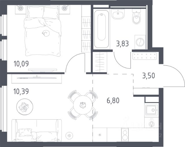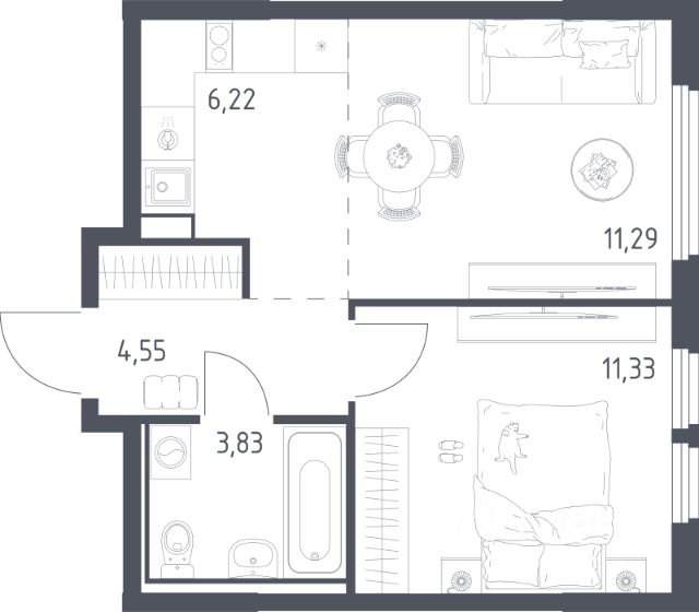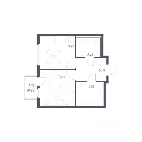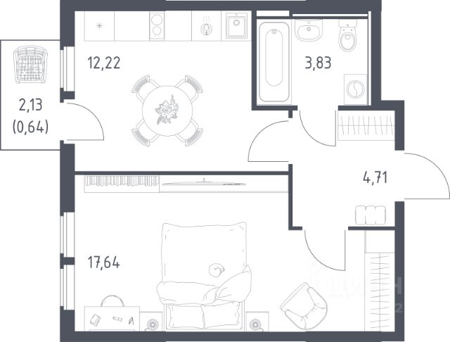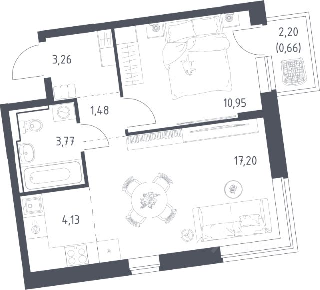 Общая площадь 41,5 м². Комната 17,9 м², кухня 10 м² с отапливаемой лоджией, просторная прихожая с нишей под гардеробную и местом для робота-пылесоса.