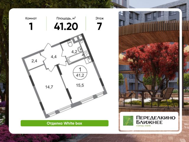 Продается однокомнатная квартира без отделки в 18 фазе города-парка "Переделкино Ближнее". Общая площадь квартиры - 41,4 кв. м, этаж 7 из 17. Срок сдачи - 2 квартал 2027 года. Тип дома - монолитный. Новый корпус состоит из 12 секций c переменной этажностью 8-17 этажей: Все секции с отделкой White Box с возможностью повышения за дополнительную плату до дизайнерской отделки: Classic или Smart+ Город-парк "Переделкино Ближнее" расположен в 8 км от МКАД по Боровскому шоссе. ТРАНСПОРТНАЯ ДОСТУПНОСТЬ: - 10 минут пешком до МЦД-4 "Мичуринец" - 14 минут на машине до станции метро "Филатов Луг" Сокольнической линии - 15 минут пешком до станции метро "Рассказовка" Солнцевской линии - 30 минут до центра Москвы - Прямой выезд на дорогу Солнцево-Бутово-Варшавское шоссе, минуя жилую застройку всего ЖК РАЗВИТАЯ СОЦИАЛЬНАЯ ИНФРАСТРУКТУРА: - 7 детских садов, 3 школы - детская музыкальная школа имени Б.Л. Пастернака - поликлиника для взрослых ГБУЗ ГП 212 ДЗМ филиал 70 - пожарная часть 66. Аварийно-спасательный отряд 6 ГКУ - банки, продуктовые магазины, аптеки, фитнес центры, салоны красоты и пр БЛАГОУСТРОЙСТВО: - дворы без машин - игровые зоны и развивающие детские площадки - детские площадки разделены по возрастным группам - зоны для пассивного отдыха - зоны для занятий спорта ОСОБЕННОСТИ АРХИТЕКТУРЫ: - переменная этажность открывает видовые характеристики на реку Алешинка и на лесопарковую зону - увеличенное остекление в квартирах - высокие потолки от 3,03 м. - безбарьерные входные группы - колясочные в каждой входной группе - кладовые помещения расположены на -1 этаже каждой секции и на 2-17 жилых этажах в секции 11 - коммерческие помещения на 1 этаже в 11 и 12 секциях - в секциях 2-4, 6-7, 11-12 по 2 лифта: 1 пассажирский, 1 грузовой - в секциях 1, 5, 8-10: 1 грузовой лифт - мусоропроводы в домах не предусмотрены, запроектированы специальные зона для сбора мусора - на фасаде предусмотрены корзины для установки кондиционеров. - видеонаблюдение установленное в холлах первых этажей, у подъездов и прилегающей территории АВТОРСКИЙ ДИЗАЙН: Входные группы выполнены по авторскому дизайну, оснащены системой "тёплый пол". В каждой входной группе будет располагаться комфортабельная зона ожидания, почтовые ящики, колясочная, акцентные пуфы и столик.