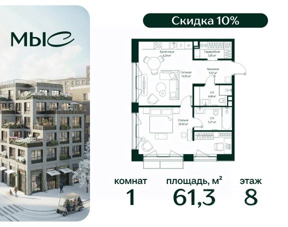 Прямая продажа от застройщика. Продаётся 1-комнатная квартира общей площадью 61.32 м² без отделки в премиальном жилом комплексе "МЫС" на 8-м этаже 12 этажного дома. Квартира расположена в корпусе "Сибирь". Проект МЫС — это, прежде всего, идеальное место для семей. В рамках проекта построят государственную школу, два детских сада и дворец спорта площадью 20 000 м2 с термальным комплексом, выплывным бассейном, фитнес-залом, теннисными, сквош и падел кортами и секциями для детей. На территории площадью, сравнимой с тремя парками Зарядье, появятся кафе и рестораны, пруд с набережной, спортивные и детские площадки, скейт-парк, лыжные и веломаршруты. Расположение: - 2 минуты до скоростной трассы М1 и Минского шоссе; - 10 минут до МКАД; - 15 минут до МЦД Лесной Городок - 20 минут до делового центра "Москва-Сити"; - 28 минут до аэропорта "Внуково". Благоустройство: - велосипедные и лыжные маршруты; - собственная набережная и парк; - лаунж-зоны в окружении природы; - беседки у очага; - дворец спорта площадью 20 000 м²; - термальный комплекс с тремя бассейнами; - 4 теннисных и падел-корта; - 6 сквош-кортов; - многофункциональный спортзал; - скейт-парк; - просторная площадь для прогулок с фонтаном; - детский клуб с творческими секциями; - гастро-доминанта; - кафе у пруда, рестораны, ритейл. Окружение - соседство с лесным фондом; - школа на 1250 мест и 2 детских сада на 350 и 255 мест; - Дубковский и Подушкинский леса, парк "Рассказовка", Мещерский парк.Действуют специальные условия при 100% оплате, подробности уточняйте у менеджера в офисе продаж.