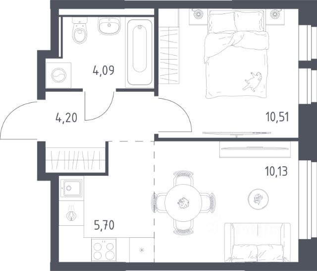 Общая площадь 28 кв.м., комната 16,2 кв.м., кухня-ниша 3,2 кв.м., санузел совмещенный 3,9 кв.м., прихожая 4,9 кв.м.