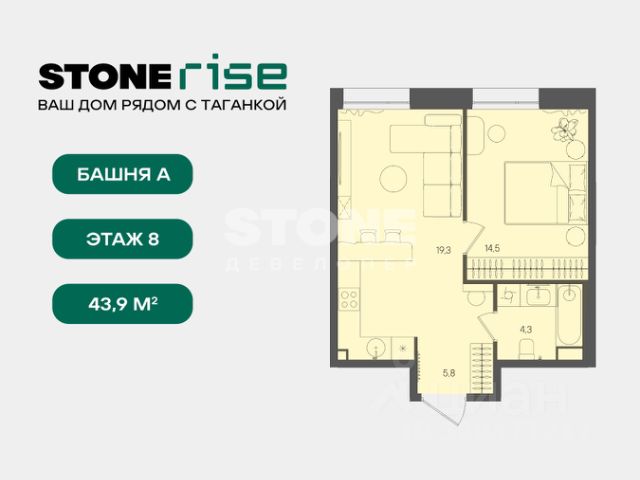 Старт продаж квартир в ЖК бизнес+ класса от девелопера STONE В продаже функциональная и светлая односпальная квартира с кухней-гостиной и одной спальней для реализации любого дизайн-решения, идеально подходящая молодым парам и небольшим семьям. Квартира расположена в камерном низкоэтажном жилом комплексе бизнес+ в одной станции от кольца. STONE Rise находится в уникальной точке с быстрым доступом ко всем ключевым локациям Москвы. Жилой комплекс располагается на границе Таганского района в одной станции от Кольцевой линии метро и в 8 минутах от Садового кольца. Близость к ЦАО обеспечивает выезды на основные магистрали. В 3 минутах от комплекса располагается новый ТПУ Серп Молот, которые объединяет 2 линии метро и МЦД. - 3 мин. м. "Римская", "Площадь Ильича" - 3 мин ТПУ "Серп и Молот", МЦД-2, МЦД-4 - 2 станции на метро до ГЭС-2 и Третьяковки, до Чистых прудов и Сретенского бульвара по салатовой - 10 минут пешком до набережной Яузы и 20 минут до трех разных парков. Архитектура Архитектурный проект разработан московским бюро WALL, известным работой над премиальными жилыми и офисными зданиями. Фасады домов выполнены из бетонной плитки серого и лого м изумрудного оттенков, а также металлических кассет. Вход в комплекс осуществляется через единое гранд-лобби. Здесь будут расположены кофейня, почты с локерами, а также комфортная гостиная с мягкой мебелью. В каждом корпусе расположены лаунж-зоны с естественным освещением в зоне лифтов. Благоустройство Территория комплекса полностью закрыта для машин и случайных посетителей. В центре - прогулочная аллея с дизайнерским освещением и местами для отдыха. В комплексе также обустроена площадка для выгула собак. Маршруты движения внутри двора продуманы для удобства пеших прогулок. Инфраструктура жилого комплекса На первых этажах комплекса расположены кафе, магазины, фитнес-студия и другие сервисные объекты. Двухуровневый подземный паркинг с возможностью выбора стандартных, увеличенных или семейных мест. Для удобства жителей предусмотрены лапомойки, келлеры, места для временного хранения велосипедов и самокатов. В STONE Rise также спроектировано многоуровневое пространство для жителей: - Бизнес-гостиная и детская-игровая, многофункциональное цифровое пространство - Благоустроенная общественная терраса с панорамными видами STONE - девелопер коммерческой и жилой недвижимости классов бизнес и премиум в Москве с 19-летним опытом. С 2022 года занимает лидирующую позицию на офисном рынке (рейтинг РБК). Сегодня в портфеле девелопера представлено 3 млн кв. м построенных, строящихся и проектируемых объектов, из которых более 1 млн кв. м находятся в стадии строительства. Компания имеет самый масштабный проектный портфель офисной недвижимости класса А на московском рынке (данные NF Group) и возглавляет топ-6 устойчивых девелоперов согласно исследованию F Research от Forbes. В 2023 году частью стратегии по развитию компании стала диверсификация портфеля, в результате которой девелопер провел ребрендинг и запусти