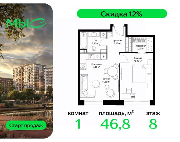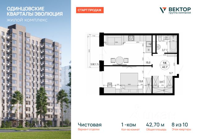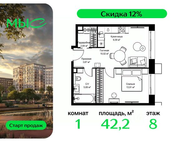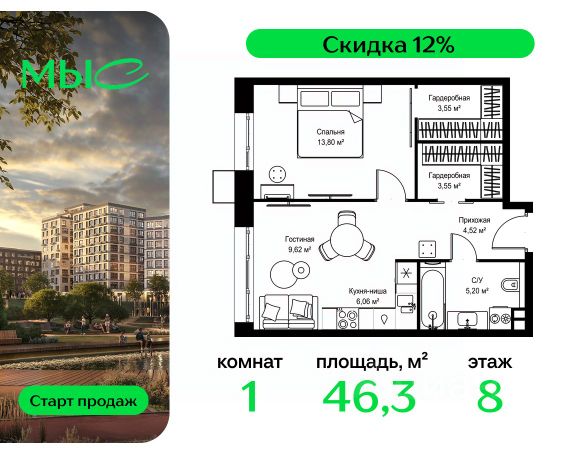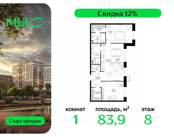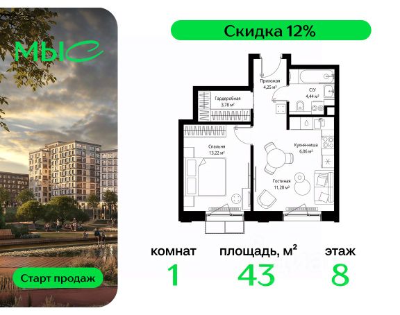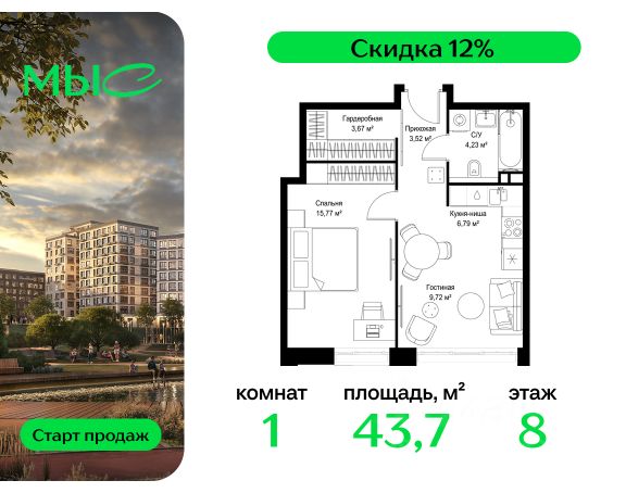 Прямая продажа от застройщика. Продаётся 1-комнатная квартира общей площадью 38.85 м² без отделки в премиальном жилом комплексе "МЫС" на 8-м этаже 12 этажного дома. Проект МЫС — это, прежде всего, идеальное место для семей. В рамках проекта построят государственную школу, два детских сада и дворец спорта площадью 20 000 м2 с термальным комплексом, выплывным бассейном, фитнес-залом, теннисными, сквош и падел кортами и секциями для детей. На территории площадью, сравнимой с тремя парками Зарядье, появятся кафе и рестораны, пруд с набережной, спортивные и детские площадки, скейт-парк, лыжные и веломаршруты. Расположение: - 2 минуты до скоростной трассы М1 и Минского шоссе; - 10 минут до МКАД; - 15 минут до МЦД Лесной Городок - 20 минут до делового центра "Москва-Сити"; - 28 минут до аэропорта "Внуково". Благоустройство: - велосипедные и лыжные маршруты; - собственная набережная и парк; - лаунж-зоны в окружении природы; - беседки у очага; - дворец спорта площадью 20 000 м²; - термальный комплекс с тремя бассейнами; - 4 теннисных и падел-корта; - 6 сквош-кортов; - многофункциональный спортзал; - скейт-парк; - просторная площадь для прогулок с фонтаном; - детский Клуб с творческими секциями; - гастро-доминанта; - кафе у пруда, рестораны, ритейл. Окружение - соседство с лесным фондом; - школа на 1250 мест и 2 детских сада на 350 и 255 мест; - Дубковский и Подушкинский леса, парк "Рассказовка", Мещерский парк. Действуют специальные условия при 100% оплате, подробности уточняйте у менеджера в офисе продаж.