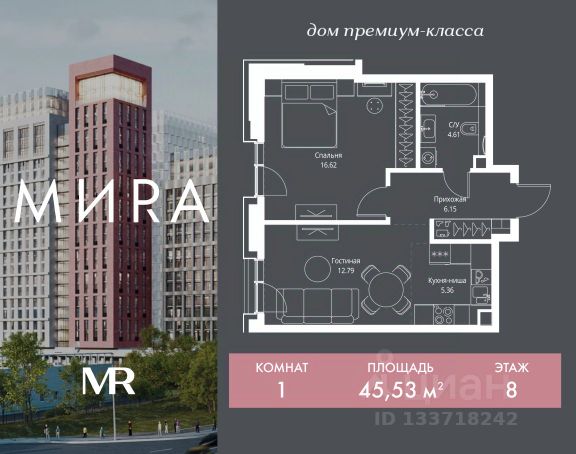 Прямая продажа от застройщика. Продаётся 1-комнатная квартира общей площадью 33.58 м² без отделки в доме премиум-класса МИRА на 8-м этаже 17 этажного дома. Квартира расположена в корпусе 1. Дом премиум-класса МИRA это: • Спокойный район с богатой историей и сложившейся инфраструктурой • Авторская архитектура на стыке классики и современности • Вход в парк прямо из жилого комплекса • Панорамные виды на Яузу, парки, ВДНХ и скульптуру "Рабочий и колхозница" • Удобные сервисы и безопасность для каждого резидента Расположение: Жилой квартал расположен в Алексеевском районе на северо-востоке Москвы, на второй линии домов, таким образом вы сможете дистанцироваться от шума и суеты проспекта Мира, но при этом будете жить недалеко от этой важной городской магистрали. Прямо у дома: • Парк Акведук • Река Яуза • Памятник "Рабочий и колхозница" Пешком: • 16 мин м. ВДНХ На автомобиле: • 12 мин ТТК • 15 мин Садовое кольцо • 12 мин Национальный парк "Лосиный остров" Благоустройство: Концепция благоустройства от бюро "ДРУЖБА" разработана в стиле "Лесная тропа". В уютном дворе расположились словно затерянные в лесу, площадки для отдыха. Они разделяются островками с травами, кустарниками, крупными камнями и деревьями, между которыми проходят узкие песчаные тропинки с деликатной подсветкой по вечерам. Центральной точкой притяжения для жителей станет главная площадь с фонтаном, которая открывается сразу из двух входных групп. Внутренний двор МИRA: • Детская площадка с зонами для игр малышей до трех лет и детей более старшего возраста • Спортивная площадка с профессиональным оборудованием для тренировок • Декоративные перголы • Воздушный арт-объект с подсветкой, похожий на облако • Чайный домик, где в отдельном отапливаемом павильоне можно в любое время года попить кофе с соседями или устроить камерное семейное чаепитие • Зоны для работы и отдыха с гамаком под навесом, скамейками и креслами Инфраструктура и окружение: В Алексеевском районе есть огромные благоустроенные парки, магазины, гимназии с высоким рейтингом и филиалы ВУЗов, частные и государственные детские сады, модные кофейни и фитнес-центры. В квартале МИRА предусмотрены: • 2 ресторана с видом на парк Акведук • 3 кафе • фитнес-студия • подземный паркинг на 330 машино-мест Компания MR предлагает своим клиентам специальные условия приобретения квартир в рамках программ ипотечного кредитования от банков-партнеров.