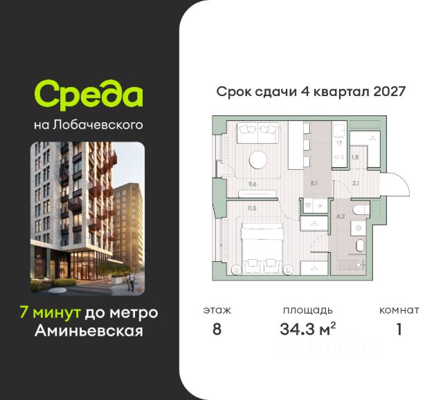 О квартире Продаётся 1-комнатная квартира общей площадью 38.9 кв.м. без отделки. Квартира расположена на 8 этаже корпуса 5.5 в жилом комплексе бизнес-класса "Среда на Лобачевского" в пешей доступности от метро "Аминьевская". О жилом комплексе "Среда на Лобачевского" полностью соответствует критериям современного жилого пространства. Взяв за основу рациональный подход, мы гармонично соединили дизайн, актуальные тренды и функциональность. Продуманный современный экстерьер и функциональные планировки внутри, приватные пространства и разнообразные досуговые зоны для каждого члена семьи — все это "Среда на Лобачевского". Инфраструктура Район отлично развит и наполнен жизнью, здесь уже есть вся необходимая инфраструктура — детские сады, школы, медучреждения, торговые центры, благоустроены парки для прогулок и отдыха, удобен и легкодоступен городской транспорт. Рядом расположены учебные корпуса крупных университетов — МГУ, МГИМО и РАНХиГС. Школы и детские сады в районе занимают высокие позиции в городских рейтингах, поэтому вам не придется беспокоиться о качестве образования детей. Как и об отдыхе: поблизости расположены живописные пруды, реки и парки. Это Парк Олимпийской деревни, Парк имени 50-летия Октября, Мещерский парк и Очаковские пруды. Теперь поставить галочки в еженедельном чек-листе "спорт-прогулки-встречи с друзьями" можно, не покидая любимый район. Особенности Особое внимание в проекте уделяется созданию функциональных пространств не только внутри дома, но и за его пределами. В ландшафтном парке "Среды на Лобачевского" расположены крытые зоны для спокойного времяпровождения, места для активного отдыха и спорта, коворкинг, соседский комьюнити-центр, водные объекты. —Ландшафтный парк во дворе. —Водный сад с зонами отдыха. —Зоны коворкинга. —Дизайнерские гранд-лобби. —Бесключевой доступ. —Подземный паркинг.