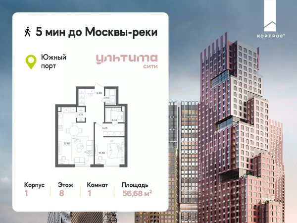 Продаётся 1-комнатная квартира от застройщика ГК "КОРТРОС" в жилом комплексе бизнес-класса УЛЬТИМА Сити. Квартира расположена на 8 этаже 45 этажного корпуса 1. Общая площадь 56,68 м². Без отделки. УЛЬТИМА Сити — жилой комплекс бизнес-класса в перспективном районе на юго-востоке Москвы. На его территории появятся 9 башен на 756 этажей, двухуровневый подземный паркинг, собственная инфраструктура, включая детский сад и школу. Всего девелопер благоустроит территорию в 2,6 га. Ближайшая станция метро — ""Южный порт"". Она откроется в 2028 году и будет находиться в 2-х минутах ходьбы. А прямо напротив расположится остановка водного автобуса-электрохода ""Синичка"". Дорога от квартала будет удобна и для автомобилистов: - до Кремля — 12 км - до МКАД — 12 км - до выезда на ТТК — 3 км - до Садового кольца — 8 км В двух корпусах первой очереди УЛЬТИМА Сити этажностью 45 и 52 реализуется 1 079 квартир с продуманными, рациональными планировочными решениями. В ассортиментной линейке представлены однокомнатные квартиры от 28,2 до 61 кв. м, двухкомнатные лоты от 44,3 до 95,4 кв. м, квартиры с тремя (71 — 115,57 кв. м) и четырьмя спальнями (106,6 — 114,97 кв. м). В экспозиции также есть квартиры с террасами, лоджиями, тремя и четырьмя санузлами, а также с функциональными нишами-кладовыми на кухнях. Запроектированы и эксклюзивные двухуровневые резиденции со вторым светом, в том числе с видом на Москву-реку, площадью от 77,7 до 141,9 кв. м. В рамках проекта запланировано строительство 9 корпусов, школы на 500 учащихся и детского сада на 225 мест. Еще будет создана продуманная инфраструктура для жителей: детские и спортивные площадки, амфитеатр для мероприятий, беседки и теплицы для садоводства, коворкинг, детский клуб и ресторан с открытой террасой. Доступ в жилой комплекс осуществляется по биометрическому контролю - Face ID. Вокруг квартала будет приватная территория с видеонаблюдением и консьерж-сервисом 24/7. Лобби корпусов будут иметь двойные выходы: на улицу и во внутренний закрытый двор.