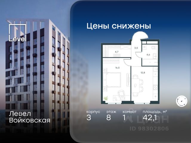 Цена указана с учётом скидки при 100%-й оплате, несубсидированной ипотеке, рассрочке (кроме программы "Рассрочка 0%"). Продается 1-комнатная квартира площадью 42.10 кв. м без отделки. Квартира находится на 8 этаже 20-этажного корпуса 3, в новом жилом комплексе бизнес-класса Левел Войковская, расположенном рядом с живописным заповедником "Покровское-Стрешнево" (застройщик - компания Level Group/Левел групп). Прекрасная транспортная доступность - 7 мин. пешком до станции МЦК "Балтийская"; - 15 мин. пешком до станции метро "Войковская"; - 8 мин. на машине до ТТК; - 15 мин. на машине до центра Москвы; - 20 мин. на машине до Москва-Сити. Продуманный архитектурный проект - стильная архитектура от мастерской Фефелова В. В.; - панорамные виды на парки, Химкинское водохранилище и Останкинскую башню; - лобби с высотой потолков до 6,45 метров; - более 20 видов планировок, включая редкие форматы квартир с террасой и увеличенной высотой потолков до 5,42 метров; - 2 варианта дизайнерской отделки в корпусе 4 как дополнительная опция к предчистовой отделке: стиль Модерн в светлых холодных тонах и стиль Классик в нейтральной бежевой гамме. Квартиры в корпусах 3 и 5 сдаются без отделки. Расположение Жилой комплекс Левел Войковская строится в престижном Северном округе Москвы, где развитая инфраструктура и живописная природа переплетаются в единый ансамбль. Войковский район окружают парки и набережные. В шаговой доступности - парк "Покровское-Стрешнево", не более 15-ти минут на велосипеде занимает путь до Тимирязевского парка и 9-ти минут до парка усадьбы Михалково. Рядом более 60 школ, 75 дошкольных учреждений, 17 государственных и 6 частных вузов, 25 супермаркетов, 4 торговых центра, среди которых ТЦ "Метрополис" и ТЦ "Авиапарк". Внутренняя инфраструктура На территории жилого комплекса предусмотрены коммерческие помещения: кафе, ресторан, пекарня и другие сервисы на первых этажах корпусов. Для жителей будет доступен отапливаемый подземный паркинг на 244 машино-места с доступом с любого этажа на лифте. На территории паркинга будет расположено 125 кладовых помещений для хранения сезонного инвентаря. Лобби и благоустройство Дизайн лобби жилого комплекса Левел Войковская создан совместно с бюро "Бланк Архитектс" (Blank Architects). Теплая цветовая гамма, ресепшен, зоны ожидания, лапомойки и гостевые санузлы - каждая деталь превращает лобби в комфортное продолжение вашего дома. 1,15 га площади в первых двух этапах строительства отведено под приватный внутренний двор, который спроектирован совместно с бюро "Правда". Детские площадки для всех возрастов, спортивные пространства для йоги, уличных тренировок и петанка, уютные зоны для тихого отдыха или работы. Здесь утро начинается с вдохновения, а вечер наполнен приятными моментами. Лифты Комфортное перемещение внутри жилого комплекса обеспечат надёжные лифты с доступом в паркинг с жилых этажей. В каждом корпусе предусмотрено по 3 грузопассажирских лифта.