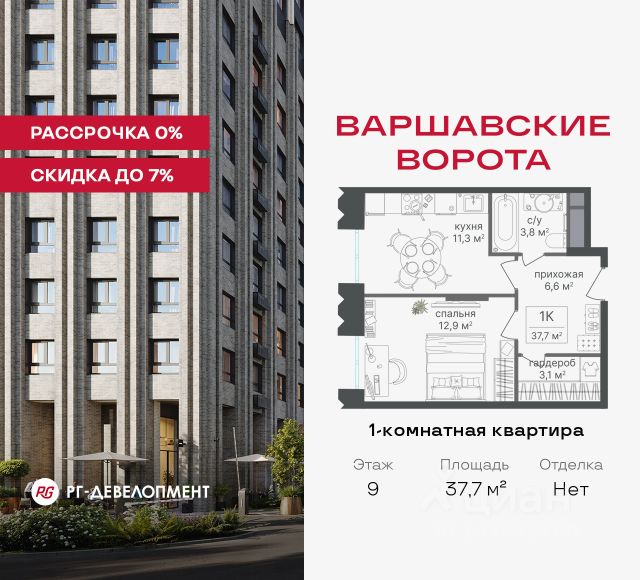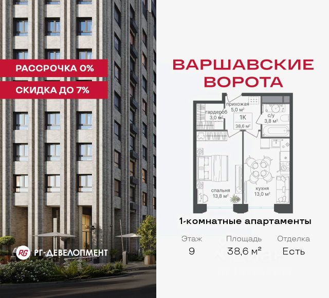 Рассрочка 0% + скидка 5%. Первый платёж 50% при ДДУ, второй 50% — через 12 мес. до ввода ЖК. Продаются 1-комнатные апартаменты 39,4 кв.м. в МФК "Варшавские ворота" на 9-м этаже 9 этажного дома. МФК "Варшавские ворота" — это проект, в котором учтен широкий спектр требований: от транспортной доступности и развитой инфраструктуры до архитектурной выразительности и экологического окружения. Апартаменты в МФК "Варшавские ворота" подойдут для тех, кто ищет продуманное жилье в Москве или готовый инвестиционный актив. Апартаменты здесь — это: - возможность жить комфортно в удобном городском формате — с природой, метро, сервисом и паркингом; - возможность купить лот с готовой отделкой, чтобы вложить минимальные инвестиции в ремонт и получить максимум возможностей от сдачи; - экономия на налоге на имущество, кадастровая стоимость апартаментов ниже ~ на 30% кадастровой стоимости квартиры; - высокая инвестиционная доходность объекта за счет более низкой цены покупки по сравнению с квартирой. Коротко о важном: - 1 минута пешком от м. Аннино; - Удобные выезды на Варшавское шоссе и МКАД; - Вид из окон на Битцевский лес и Аннинский лесопарк; - Высота потолков 2,7 - 3 м; - Закрытый двор-парк; - Школы и детские сады в 10-15 минутах пешком от дома; - Технические лоджии для размещения кондиционеров; - Подземный паркинг; - РГ-Девелопмент — ТОП-20 крупнейших застройщиков России. Проект сочетает в себе современную архитектуру и продуманное благоустройство с уникальным природным окружением. Всего в нескольких минутах от дома — девять парков, каскад прудов и крупнейшие лесопарковые зоны Москвы, создающие ощущение жизни в зеленом оазисе посреди мегаполиса. Архитектурная концепция - стиль Чикаго в Москве. Выполнена в минималистичной эстетике с использованием клинкера и декоративного кирпича. Фасады подчеркивают строгие линии и современный стиль, а входные группы разработаны московским бюро Syntaxis. Лобби оформлены с применением керамогранита, декоративной штукатурки и гипсовых панелей, детали из латуни добавляют изысканности. Пространство оживляют гербарии, композиции из сухоцветов и авторские панно. Проект находится в одной минуте пешком от метро "Аннино", в 12 минутах от станции "Улица Академика Янгеля" и рядом с МЦД-2 "Красный Строитель". Для автомобилистов предусмотрен прямой выезд на Варшавское шоссе и два съезда на МКАД, что позволяет быстро добираться в любую часть города. Среди планировочных решений представлены разнообразные форматы: от функциональных студий до просторных 4-комнатных квартир и апартаментов площадью от 22 до 105 м². Высокие потолки усиливают ощущение простора, а продуманные планировки включают мастер-спальни, гардеробные, угловые окна, объединённые кухни-гостиные и несколько санузлов. Центральное пространство комплекса — закрытый двор без машин. Он разделён на функциональные зоны: детские игровые комплексы, спортивные площадки, воркаут-зоны и уютные места для тихого отдыха. На первых этажах разместя