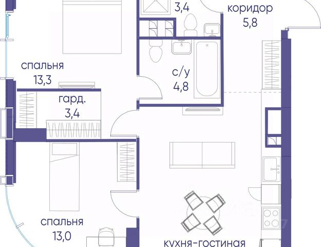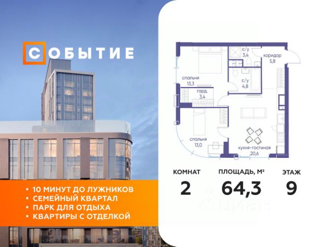О квартире Продаётся однокомнатная квартира общей площадью 35.30 кв. м. с отделкой на выбор: черновая, White Box. Квартира на 9 этаже корпуса 5.2 в жилом комплексе бизнес-класса "Среда на Лобачевского". До метро "Аминьевская" 7 минут пешком. Развитый район с удобным выездом "Среда на Лобачевского" строится рядом с Аминьевским и Очаковским шоссе, отсюда можно доехать до МКАД или Ленинского проспекта за 10 минут. В районе уже есть всё для жизни: рестораны, кофейни, торговые центры, поликлиники и спортивные комплексы, школы и сады, бульвары и парки. - 7 минут ходьбы до станции метро "Аминьевская". - 15 минут пешком до станции МЦД-4 "Очаково". - 8-15 минут на машине до Кутузовского проспекта и ТТК. - До 15 минут езды до заказников "Долина реки Сетунь" и "Воробьёвы горы". Акции и спецпредложения - Выгода 12%: если внести 100% оплату или оформить семейную ипотеку под 6%. Действует до 13 апреля. - Низкие ставки по ипотеке: 0,1% в первый год или 0,11% в первые два года кредита. - Трейд-ин от "Среды": можно обменять свою текущую квартиру на новую. - Ипотека для семей с детьми: если ребёнку до 7 лет, предлагаем льготную ставку 3,5% О жилом комплексе "Среда на Лобачевского" - новый квартал в парадном стиле старой Москвы. Благодаря разноэтажной застройке во дворе комплекса будет много света и воздуха, без ощущения замкнутого пространства. Во дворе лаунж-зоны для медитации и работы, площадки для игр и кинопоказов, а на первых этажах - кофейни и магазины. Особенности - Высота потолков до 3,24 метра. - Панорамное остекление в пол. - Квартиры с террасами, мастер-спальнями и сквозными планировками. - Дизайнерские гранд-лобби в каждом корпусе. - Ландшафтный парк с зонами отдыха у воды. - Коворкинг на свежем воздухе. - Локации для спорта, игр и приватного отдыха. - Соседский бульвар с площадкой для подростков. - Подземный паркинг с двумя въездами. - Система бесключевого доступа. - Стрит-ритейл на первых этажах.