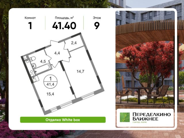 Продается однокомнатная квартира в городе-парке "Переделкино Ближнее". Общая площадь квартиры - 38,8 кв. м, этаж 9 из 17. Срок сдачи - 3 квартал 2026 года. Тип дома - монолитный. Город-парк "Переделкино Ближнее" расположен в 8 км от МКАД по Боровскому шоссе. ТРАНСПОРТНАЯ ДОСТУПНОСТЬ: - 10 минут пешком до МЦД-4 "Мичуринец" - 15 минут пешком до станции метро "Рассказовка" Солнцевской линии - 10 минут на машине до станции метро "Филатов Луг" Сокольнической линии - 30 минут до центра Москвы - Прямой выезд на дорогу Солнцево-Бутово-Варшавское шоссе, минуя жилую застройку всего ЖК БЛАГОУСТРОЙСТВО: Новая фаза строительства уникальна своим расположением - в шаговой доступности парк на Лукинской улицы, река Алёшинка. На территории 18 фазы строительства будут построены 2 монолитных жилых корпуса повышенного комфорта разной этажности 7, 17 этажей. А также многоуровневый паркинг на 300 м/мест. Вход в жилую часть корпусов каждой секции осуществляется с двух сторон - с наружного контура жилого дома и со стороны дворового пространства, предусмотрен безбарьерный доступ. ВНУТРЕННЯЯ ИНФРАСТРУКТУРА: В рамках данной фазы, для жителей предусмотрено создание пространства, свободного от машин - благоустроенные огороженные дворы с современными детскими и спортивными площадками, разделенными на зоны по возрастам. На территории проекта есть все необходимые объекты социальной и бытовой инфраструктуры: детские сады, школы, магазины, паркинги, аптеки, поликлиники, пожарная часть и др. АВТОРСКИЙ ДИЗАЙН: Современный монолитный дом переменной этажности 7 и 17 этажей. На фасаде предусмотрены корзины для установки кондиционеров. Входные группы домов выполнены по авторскому дизайну. Колясочные располагаются при входе, велопарковка на -1 этаже.