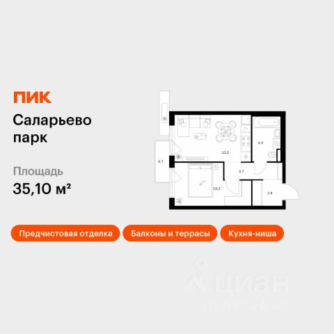 Продаётся 1-комн. квартира площадью 36,6 кв.м на 9 этаже 18 этажного дома (Корпус 74.6, Секция 6) проекта ПИК Саларьево парк. Светлый просторный подъезд на уровне земли, функциональная планировка, большие окна, c отделкой. Жилой район "Саларьево парк" расположен в Новой Москве, в четырёх километрах от МКАД по Киевскому шоссе. Две станции метро: "Саларьево" и "Филатов луг", — находятся в пешей доступности от проекта. Дойти до них можно за 510 минут. В квартале уже создана качественная среда, где есть абсолютно всё для полноценной жизни, работы и отдыха. Благодаря удобному расположению проекта всё важное будет рядом: детские сады, школы, кафе и рестораны, шопинг в торговых центрах, фитнес и даже аэропорт. Все корпуса в квартале гармонично сочетаются, образуя единую городскую среду. Между собой их объединяет невысокая этажность и натуральная цветовая гамма. Здесь приятно гулять и проводить время на улице всей семьёй. В "Саларьево парке" создана уникальная образовательная среда, включающая в себя шесть школ, рассчитанных на 6 250 учеников. Две из них уже открыты, их посещает 2 300 детей. Также на территории "Саларьево парка" находится 12 детских садов, один из которых с бассейном. Сейчас уже открыты 7 садов. В "Саларьево парке" открыта уникальная игровая площадка — PlayHub "Оригами". Здесь есть ручей, горка-труба и рельефные холмы. Взрослые смогут отдохнуть в уютном кафе, пока дети играют. Также на территории проекта есть SportHub — большая спортивная зона, разделённая по интересам и возрастам. Здесь можно заниматься разными видами спорта: футболом, баскетболом, волейболом и стритболом. Зимой центральную часть площадки превращают в каток. Во дворах-парках жилого квартала есть места для отдыха, детские и спортивные площадки. На первых этажах домов расположены магазины, кафе и полезные сервисы. Также вблизи проекта есть несколько масштабных торговых центров. До ТЦ "Саларис" пять минут пешком, до "Рио", Metro Cash & Carry и "Леруа Мерлен" — пять минут на автомобиле. Артикул 1006867 (Застройщик ООО "Специализированный Застройщик "Тирон")