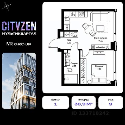 Продажа 1-комнатных квартир на 9 этаже рядом с метро Тушинская