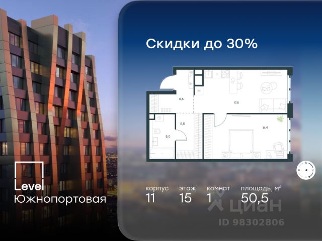 Цена указана с учётом скидки при 100%-й оплате, несубсидированной ипотеке, рассрочке (кроме программы "Рассрочка 0%"). В северной части района Печатники продается 1-комнатная квартира площадью 50.50 кв.м без отделки. Квартира расположена на 15 этаже 16-этажного корпуса 11 в жилом комплексе комфорт-класса Level Южнопортовая (компания Level Group/Левел групп). Отличная транспортная доступность: - 10 мин. пешком до станции метро "Кожуховская"; - 20 мин. пешком до станции МЦК "Дубровка"; - 3 мин. на авто до ТТК; - 13 мин. на авто до Садового кольца; - 15 мин. на авто до Бульварного кольца. Продуманный архитектурный проект: - авторская архитектура от бюро СПИЧ; - уникальные виды на реку, парки и достопримечательности города; - высота потолков в квартирах до 6 м; - окна высотой до 1,87 м с высоким коэффициентом сопротивления теплоотдаче. Расположение: Level Южнопортовая строится в северной части района Печатники - самой приближенной к центру. Здесь будет сформирован новый район "Южный порт", где построят крупный жилой и общественно-деловой центр, аналогичный Москва-Сити. В течение 10-12 лет в этом месте появятся не только жилые дома, но и развитая инфраструктура для жизни и работы. А еще совсем рядом находится набережная Москвы-реки, где планируется построить причалы для речных трамвайчиков и канатную дорогу. Уже сейчас вокруг жилого комплекса работают десятки магазинов и торговых центров, рядом расположено 6 парков, среди которых музей-заповедник "Коломенское". В 10 минутах пешком - 2 муниципальных и 2 частных детских сада, 7 общеобразовательных школ. Внутренняя инфраструктура: Для отдыха жителей в каждом корпусе предусмотрено лобби, оснащенное местами для отдыха, гостевыми санузлами и лапомойками, а в отдельных корпусах - камином. За счёт больших окон и высоких потолков пространства будут наполнены воздухом и светом. На первых этажах жилого комплекса откроются магазины, салоны красоты, фитнес-центр. Для детей строятся собственные детский сад и школа. Благоустройство: Внутренний двор комплекса разработан совместно с бюро GAFA. Основная идея - создать аналог Центрального парка в Нью-Йорке, гармонично сочетая высотные здания и большое изолированное парковое пространство. Вся площадь двора-парка будет огорожена и составит более 2 га, из которых 45% - озеленение. Одним из самых важных ландшафтных элементов здесь станет небольшая речка, наполняющаяся во время дождя. Вокруг неё появится сеть из островов, внутри которых расположатся тематические зоны спорта и отдыха. Технологии и инженерия: - автоматическая передача в управляющую компанию показаний квартирных счётчиков; - телефонная связь, телевидение и интернет на базе оптической мультисервисной сети; - гостевой Wi-Fi в лобби и на территории двора; - единый ключ доступа для входа на территорию комплекса.