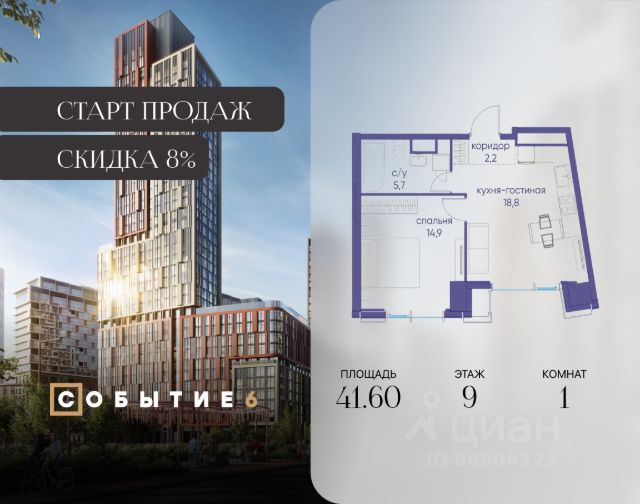 Скидка до 8% действует до 25.12.2025 г. при 100% оплате и не субсидированной ипотеке. Продаётся 1-комнатная квартира от застройщика: общая площадь 41.60 м², жилая 14.90 м², кухня 18.80 м², 5-й этаж, жилой квартал "Событие-6", корпус 2 (секция 5) Срок сдачи: 1 квартал 2029 года. Позвоните сейчас и забронируйте квартиру! Продуманный до деталей. Созданный для жизни, полной счастливых событий. Парк-квартал СОБЫТИЕ - это жизнь класса премиум в престижном районе на Мосфильмовской улице. Архитектура мирового уровня. Выигрышное расположение на границе природного комплекса "Долина реки Раменки". Все для комфортной жизни и досуга: от детсадов и школ до ресторанов и медцентров. И новая точка притяжения - уже готовый парк "Событие" с пространствами активности для всех возрастов и интересов. Особенности квартала: • "Парящие" мосты и парк под облаками - уникальный дом с самыми завораживающими видами из окон "в пол" • Собственный парк - сразу за порогом! • Архитектурная концепция от известных международных бюро LDA Design и UHA London • Инфраструктура "тапочной доступности": в кафе, школу, магазин - за пару минут! • Внутренний двор - настоящее продолжение вашего дома: закрытая охраняемая территория без машин, развивающие детские площадки, воркауты-зоны для тех, кто хочет быть в форме, площади для праздников и посиделок с соседями. Купить квартиру евродвушку в новостройке рядом с метро Мичуринский проспект.
