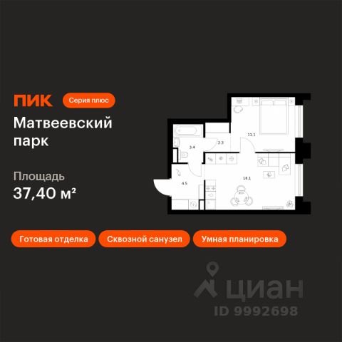 Продаётся 1-комн. квартира площадью 37,7 кв.м на 1 этаже 17 этажного дома (Корпус 1.6, Секция 8) проекта ПИК Матвеевский парк. Светлый просторный подъезд на уровне земли, функциональная планировка, большие окна, c отделкой. "Матвеевский парк" — проект "Серии плюс", расположенный на западе Москвы, в районе Очаково-Матвеевское. Ближайшая станция метро "Аминьевская" находится всего в 3 минутах пешком, а в 20 минутах — МЦД-4 "Очаково". Проект входит в состав Матвеевского кластера — современного района, где есть всё необходимое для комфортной жизни: социальная инфраструктура, парки и общественные пространства. Проект расположен в Матвеевском кластере — новом современном районе, который будет состоять из четырёх кварталов: "Матвеевский парк", "Новое Очаково", "Большая Очаковская 2" и Вангарден. Перемещаться между кварталами будет удобно по 350-метровому пешеходному мосту, под которым появится уютный зелёный парк. У проектов будет общая инфраструктура и благоустроенная территория. Уже открыта часть пешеходного бульвара, который строится по проекту британского бюро. Здесь можно гулять после работы, играть с детьми, заниматься спортом и отдыхать у сухого фонтана с ночной подсветкой. В будущем в кластере появится пешеходный мост, который соединит жилые кварталы, и комьюнити-центр "ОМА" с магазинами, кафе, местами для спорта, встреч и общения. Отдыхать и заряжаться адреналином жители кластера смогут в СпротХаб Экстрим — зоне площадью более 3 500 м², рассчитанной на любителей экстремальных видов спорта. Здесь будут площадки для безопасного катания на скейтбордах, роликах, самокатах и велосипедах. Для командных игр — например, мини-футбола и стритбола — появится отдельная универсальная площадка с покрытием из резины. Помимо этого, на территории "Матвеевского кластера" начнут работу пять новых школ, шесть детских садов, поликлиника и многофункциональный спортивный комплекс. Архитектурную концепцию корпусов 4 квартала разработало российское бюро "КАТАРСИС". Акцентные белые корпуса с большими окнами делают архитектуру проекта мощной и запоминающейся. А фоновые части зданий придают образу размеренность и спокойствие. В лобби "Матвеевского парка" будет удобная зона ожидания, где можно встретить друзей, курьера или дождаться такси, а также гостевая туалетная комната и колясочная. Артикул 746961 (Застройщик ООО "СПЕЦИАЛИЗИРОВАННЫЙ ЗАСТРОЙЩИК "ЦЕНТРПОЛИС")
