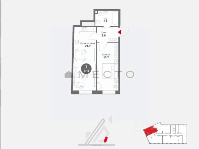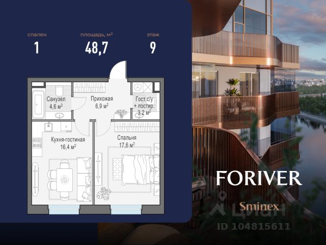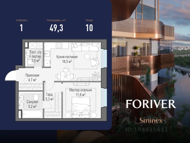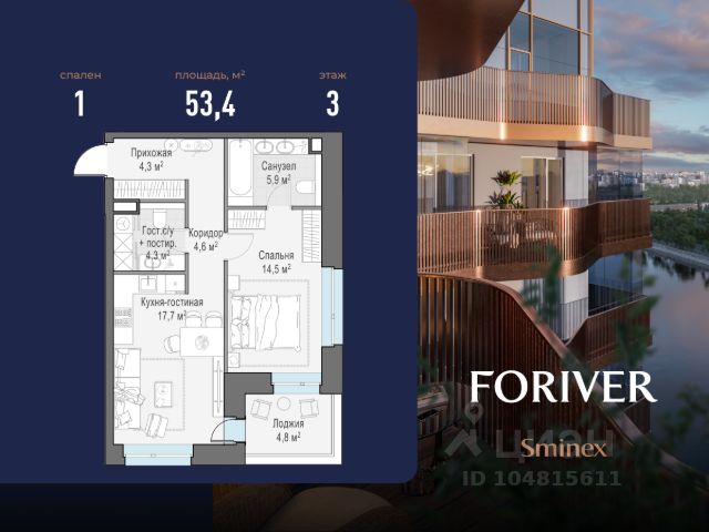Квартира расположена на 7 этаже 19-этажного монолитного дома, срок выдачи ключей в конце 2025 года. Общая площадь — 43,1 кв. м, высота потолков — 3,3 м. Жилая площадь составляет 14,5 кв. м, площадь кухни — 18,8 кв. м. Окна выходят не на жд пути. В квартире есть совмещённый санузел.