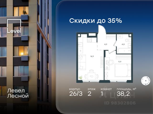 Цена указана с учётом скидки при 100%-й оплате, несубсидированной ипотеке, рассрочке (кроме программы "Рассрочка 0%"). В районе, утопающем в густой зелени лесов, многочисленных парков и скверов, продаётся 1-комнатная квартира площадью 38.20 кв.м без отделки. Квартира расположена на 2 этаже в жилом комплексе комфорт-класса Левел Лесной (компания Level Group/Левел групп). Отличная транспортная доступность: - 25 мин. пешком до станции метро "Пятницкое шоссе"; - 28 мин. на автобусе до станции метро и МЦД-2 "Волоколамская"; - 11 мин. на авто до МКАД; - 25 мин. на авто до ТТК. Продуманный архитектурный проект: - Концепция проекта Левел Лесной от бюро СПИЧ; - Высотность комплекса до 15 этажей с уникальными видами на лесные массивы и город; - Высота потолков до 3 м; - Современные окна высотой до 1,6 м, в части квартир предусмотрены окна в пол. Высота подоконников 0,6 м; Расположение: Жилой комплекс Левел Лесной строится в зелёной зоне ближайшего Подмосковья, г.о. Красногорск в посёлке Отрадное. Шаговая и автомобильная доступность до метро и больших транспортных артерий города. За 25 минут вы дойдёте до станции метро "Пятницкое шоссе", а за 20 минут на машине сможете доехать до станции метро "Тушинская". Район окружен роскошной зеленью лесов и парковых зон, занимающих территорию свыше 1 000 гектаров. Помимо благоприятной экологии, здесь множество возможностей для активного отдыха и поддержания физической формы. Облагороженная территории с полностью развитой инфраструктурой. На территории проекта находится детский сад и школа "Светлые Горы", которая входит в список лучших частных школ от Forbes Education (по данным на 2023г.). Кроме того, в пешей доступности расположено ещё 8 детских садов, а также запланировано открытие современной муниципальной школы. В непосредственной близости находятся сетевые супермаркеты и локальные магазины, аптеки, клиники, почта, библиотека, салоны красоты, рестораны, спортивные и творческие секции, развивающие детские центры. В 12 минутах пешком расположен торговый парк "Отрада" с продуктовым и строительным гипермаркетами, магазинами, кинотеатром и развлечениями для детей. Внутренняя инфраструктура: Мы знаем, как важно, чтобы магазины и сервисы были всегда рядом. В сданных корпусах жилого комплекса Левел Лесной уже расположена полностью готовая развитая инфраструктура. На первых этажах корпуса 27 предусмотрено ещё 14 коммерческих помещений. Благоустройство: Продуманное пространство и аура приватного европейского городка рождают чувство лёгкости и расслабления у каждого, кто попадает на территорию проекта. Концепцию общественных площадок разработали в партнёрстве два архитектурных бюро: "Хайлайт Архитектура" (Highlight Architecture) и "Скейп" (Scape). В безопасных дворах без машин каждый обязательно найдёт себе место для вдохновения, отдыха и спорта.