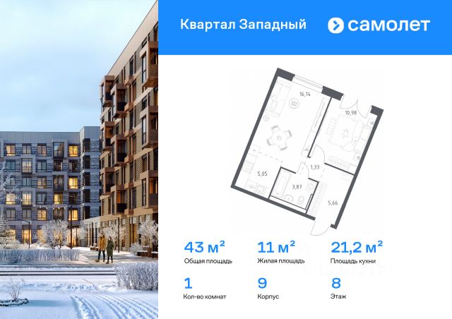 Строим кварталы для жизни с заботой о будущем. Предлагается 1-комнатная квартира комфорт-класса 41,44 кв.м в корпусе 9 на 9 этаже, в ЖК "Квартал Западный" Квартира без отделки. Доступность опции "отделка" и возможность комплектации мебелью и декором уточняйте у застройщика. Приобрести квартиру возможно по специальным акциям от застройщика, с текущими условиями акций можно ознакомиться в блоке "Акций". Цена динамическая и может отличаться, уточняйте актуальность у застройщика. Жилой комплекс в окружении лесопарков и рядом с рекой. До станции МЦД-4 "Санино" можно дойти пешком за 7 минут, а на территории проекта появится транспортно-пересадочный узел с торговым центром. Для жителей построят школу, 2 детсада, в одном из которых будут развивающие кабинеты-трансформеры. Дворы — тихое зеленое пространство без машин. В проекте появится собственный ландшафтный парк с благоустроенной набережной и центральная площадь, на которой будут проводиться различные мероприятия. Высота домов — от 5 до 15 этажей. Фасады выполняют в естественных оттенках, в соответствии с дизайн-кодом "Полевой луг". У каждой секции — свое цветовое решение. Белый цвет верхних этажей добавляет застройке легкости. Фасады облицованы клинкерным глазурованным кирпичом, который используют в проектах бизнес-класса.