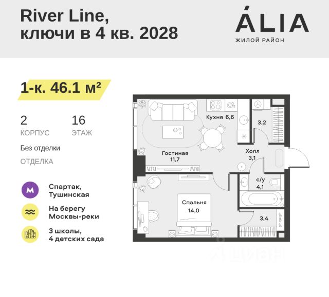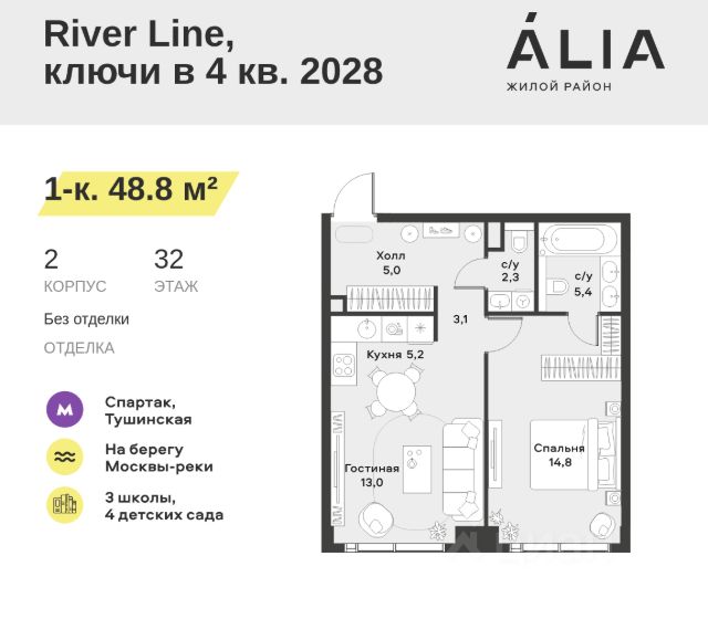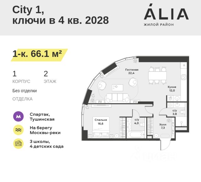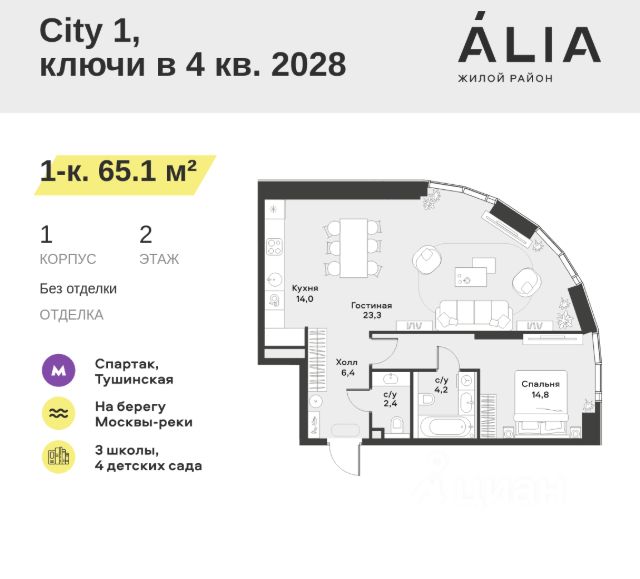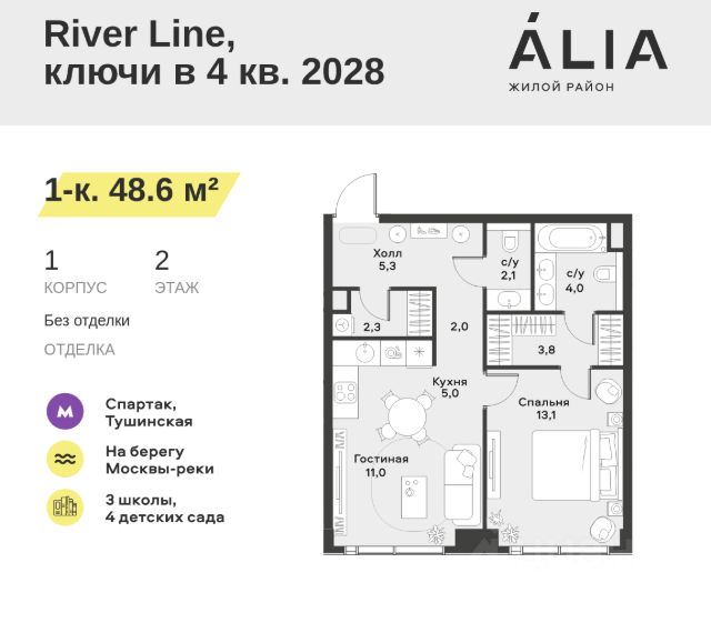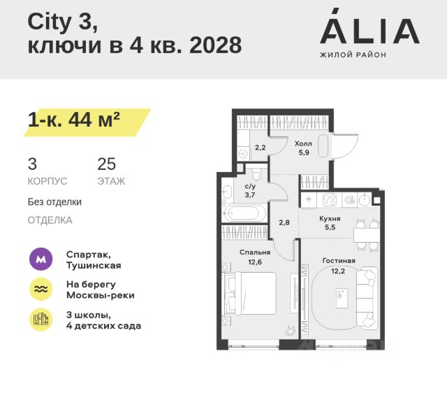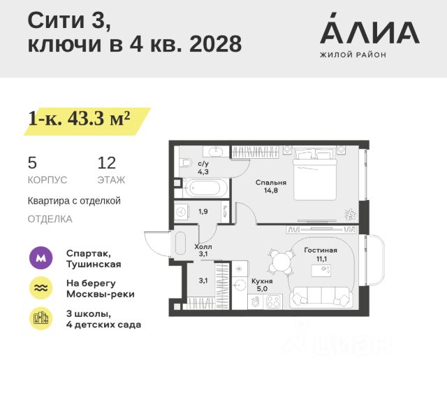 Продаётся 1-комнатная квартира 36.1 м². В жилом районе Алиа на 8-м этаже 30-этажного дома. Жилой район Алиа — это дома бизнес-класса у слияния Москвы-реки и Сходни. Алиа находится в Покровском-Стрешневе, экологически чистом районе на престижном северо-западе столицы. Район возводится на бывшей территории Тушинского аэрополя, где никогда не было промышленного производства. Алиа — это район разностороннего развития, спроектированный по принципу WORK.LIVE.PLAY.LEARN. Это "15-минутный город", где вся необходимая для комфортной жизни инфраструктура — на расстоянии приятной прогулки. У района удобное расположение: отсюда меньше 10 минут пешком до станций метро "Спартак" и "Тушинская" и всего полчаса на автомобиле до центра города или аэропорта Шереметьево. Архитектурную концепцию Алиа разработало бюро SOM (Skidmore, Owings & Merrill), авторы знаменитой "Бурдж-Халифа". В Алиа больше 140 планировочных решений, среди которых — редкие для Москвы форматы: квартиры с окном в ванной, пентхаус, сити-юниты и таунхаусы. Почти половина территории района отдана под благоустройство. В Алиа три парка: Линейный парк с кафе и магазинами, Центральный парк с амфитеатром, сухим фонтаном и большим плейхабом для детей всех возрастов и Прибрежный парк на собственной набережной, одной из самых длинных в Москве. В каждом урбан-блоке — закрытый внутренний двор с гипоаллергенными растениями и детской площадкой. В лобби каждого жилого корпуса в Алиа оборудована зона ожидания, колясочная, гостевой санузел и лапомойка для домашних животных. За стойкой ресепшена резидентов и их гостей встречает консьерж. Центральное лобби урбан-блока — это стильное общественное пространство с коворкингом, лаундж-зоной и кофе-пойнтом. Это "вторая гостиная" жителей урбан-блока и одно из мест, где формируется комьюнити Алиа. Два ключевых объекта инфраструктуры в Алиа — это спорткомплекс "Чкалов Арена", где представлены 25 видов спорта, и самый большой в стране бизнес-парк класса A, благодаря которому району обеспечено быстрое развитие.