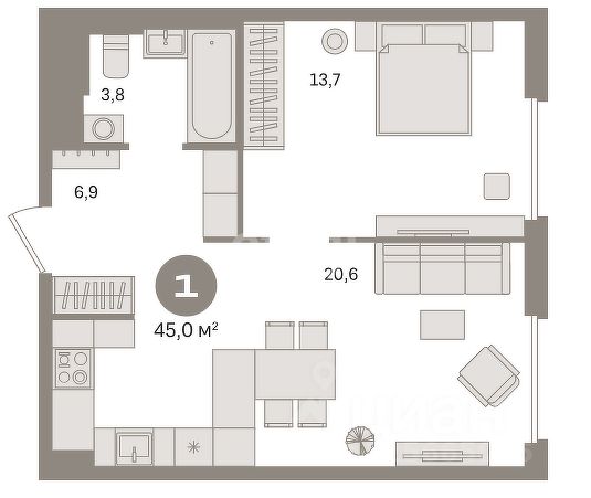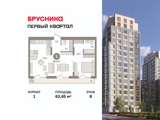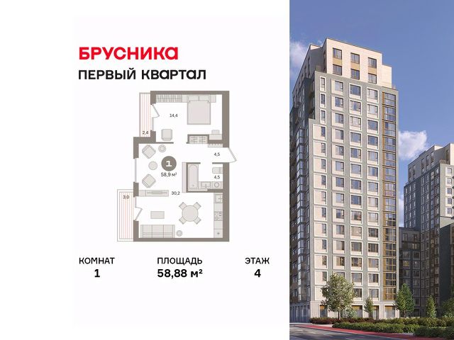 Квартира с кухней-гостиной и одной спальней в "Первом квартале". Особенности планировки: мастер-спальня, предчистовая отделка. квартиры в нашей базе: МТК04-Ж1.4.4.