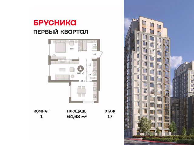 Продаётся с кладовой. Квартира с кухней-гостиной и одной спальней в "Первом квартале". Особенности планировки: предчистовая отделка. квартиры в нашей базе: МТК06-Ж3.7.5.