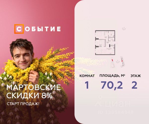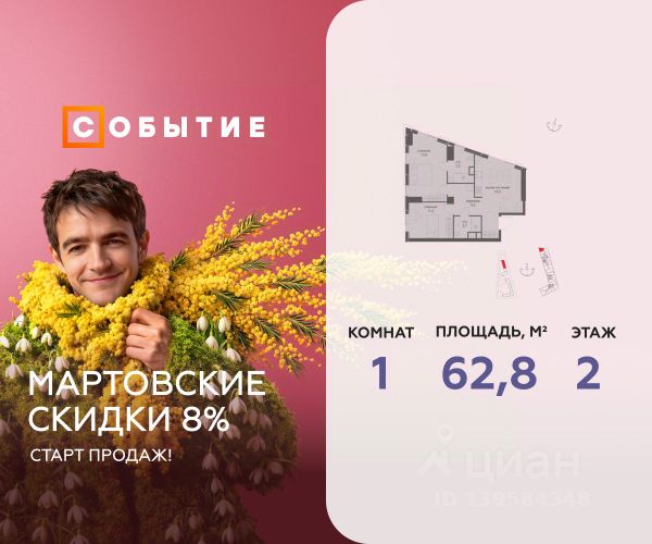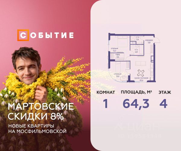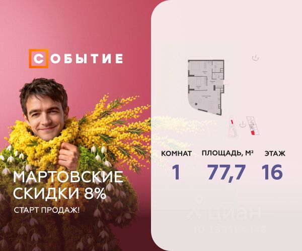 Весь март - скидка до 8% действует до 31.03.2026 г. при 100% оплате и не субсидированной ипотеке! В продаже 1-к квартира от застройщика. Общая площадь 45.4, жилая 27.4, кухня 18. Квартира расположена на 8 этаже жилого квартала "Событие-6", корпус 1, Секция 1. Квартира без отделки. Срок сдачи: 4 кв. 2029 года. СОБЫТИЕ.6 — финальный дом парк-квартала СОБЫТИЕ на Мосфильмовской. Переезжайте в уже сформированный квартал с готовой инфраструктурой и парком! Премиальный жилой комплекс в престижном районе Москвы предлагает стильную архитектуру, продуманное благоустройство и великолепно разнообразие общественных пространств. Свой парк прямо возле дома! Архитектура Архитектура СОБЫТИЯ.6 выполнена в ультрасовременном стиле московским бюро Atrium на основе дизайн-кода британских архитекторов LDA Design и UHA London. Дом отличает оригинальная геометрия фасадов, большое остекление и высокие лобби (до 6,2 м) с авторской мебелью и светильниками. Расположение Мосфильмовская улица (Раменки) — один из престижных районов Москвы. Близость к историческому и деловому центру, природным зонам Запада столицы. Транспортная доступность: • 10 мин до Москва-Сити и ТТК; • 15 мин до Садового кольца; • 25 мин до аэропорта Внуково; • 7-10 мин до станций метро "Аминьевская" и "Мичуринский проспект". Инфраструктура: • парк "Событие" (12 га, финалист конкурса Правительства Москвы) с беговыми (1,5 км) и велодорожками (2,7 км), экотропой (1,6 км), площадками, лекторием; • школа, детский сад, магазины, салоны красоты, рестораны (к моменту заселения); • мультидвор с игровыми и спортивными площадками, мини-бульваром; • общественная терраса на 10-м этаже (коворкинг, лаунж); • Закрытые общественные пространства: детская комната, спортивный зал, коворкинг, лаунж-зоны. Паркинг 256 мест для жителей (48 — для электромобилей), 24 гостевых (5 — для электромобилей), мойки колес, кладовые, зоны для велосипедов. Окружение Парки и заповедники (Воробьёвы горы, Матвеевский лес и др.), МГУ, театр им. Н. И. Сац, стадион "Лужники". Безопасность Видеонаблюдение, контроль доступа, видеодомофоны, консьерж-сервис 24/7, системы пожарной безопасности и мультисервисная оптическая сеть.