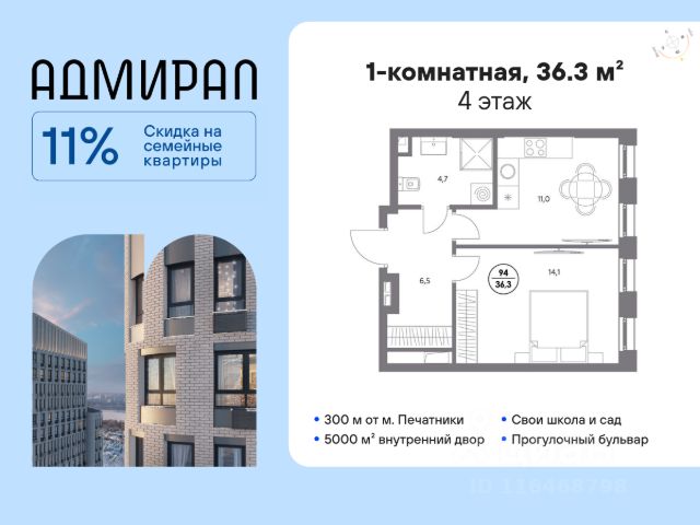 В динамично развивающемся районе Москвы, всего в 300 метрах от метро и в пешей близости от нового городского порта с протяженной набережной 13 км, свободной от автомобилей, продается 1-комнатная квартира площадью 35.40 м². без отделки. Квартира находится в корпусе жилого комплекса бизнес-класса "Адмирал", расположенного по адресу г. Москва, ул. Шоссейная, 4Д. (Застройщик - "Галс Девелопмент"). Новый амбициозный проект "Адмирал" станет частью одного из самых перспективных районов будущего - "Сити-2". В пешей доступности от современных башен Вас ждут живописные Люблинские пруды, 2 усадьбы с уникальной историей и уютный парк "Печатники" у Перервинского плёса. Район имеет отличную транспортную доступность: • 300 метров до станции метро "Печатники"; • Удобная пересадка на БКЛ и станцию МЦД-2; • 10 минут на машине до ТТК; • 15 минут до Садового кольца. Архитектура корпусов отличается динамичностью облика благодаря переменной этажности: высокие башни сочетаются с домами средней этажности. Изящным украшением становятся арочные витражи. Интеллигентный и современный стиль "Адмирала" продолжается в гранд-лобби: пастельные оттенки интерьера и фактурные элементы декора создают атмосферу безмятежного отдыха, особое ощущение простора дарят высокие потолки до 4 м и витражные окна. В домах предусмотрено от трех до шести скоростных лифтов, каждый из них спускается на любой этаж подземного паркинга и обладает удобными сенсорными панелями управления и низким уровнем шума. Благоустроенный двор площадью 5000 кв.м. украсят десятки видов гипоаллергенных растений. Здесь можно совершить приятный променад, по пути заглядывая за свежезаваренным кофе, уединиться за ноутбуком в комфортном коворкинге, занять ребенка играми в двухъярусном плейхабе или помедитировать на специальной площадке для йоги. Мягкий свет декоративных фонарей подчеркнет живописность местности, а чувство безопасности гарантируют круглосуточные системы видеонаблюдения. Дополнительные преимущества: • Высокие потолки от 2,9 до 3,25 м; • Бизнес-центр, школа и детский сад прямо на территории дома; • Подземный двухуровневый паркинг на 1955 машино-мест; • Кладовые помещения в тёплом контуре на 2м этаже; • Стрит-ритейл на первых этажах.