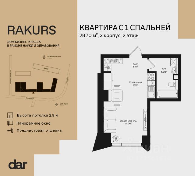 Продаётся 1-комнатная квартира 36.40 м² в жилом комплексе Ракурс. Квартиру отличают панорамное остекление, потолки 3,1 м, улучшенная шумо и воздухоизоляция. Дом сдаётся в 1 квартале 2028 года, продажи проходят через эскроусчета. Подземный паркинг, коворкинг, закрытая благоустроенная территория с фонтаном и артобъектами. Гибкие условия покупки. Rakurs — место, в котором жизнь приглашает к исследованию. Концепция проекта knowledge-centric среда, которая выражается здесь в образе жизни: • атмосфере интеллектуальной среды, • доступности образования, • фокусе на возможности для развития. RAKURS разместился в районе науки и окружен исследовательскими институтами и образовательными учреждениями, при этом на территории построена своя школа с уникальной концепцией. Расположенный на пересечении улиц Маршала Бирюзова и Берзарина, недалеко от станций метро "Октябрьское поле" и "Зорге", дом угождает транспортной доступностью автомобилистам и пешеходам. Инфраструктура же района создана с заботой о людях: здесь много парков, кафе и других уютных мест для отдыха. В состав комплекса входят три башни высотой 18, 26 и 44 этажа, каждая из которых имеет свой запоминающийся силуэт. Между собой башни связаны среднеэтажными строениями с индивидуальными фасадами. Композиция и пластика корпусов, а также панорамное остекление башен обеспечивают квартиры максимальным количеством дневного света и выигрышными видами на центр города и Москву-Сити. Упор на функциональность не лишает проект его уникального образа — все башни имеют неординарную форму с харизматичными уступами и консолями. Rakurs предлагает широкий выбор уникальных вариантов жилья — от студий до эксклюзивных квартир с приватными террасами. Проект спроектирован с фокусом на биофильность и функциональность. Во дворах Rakurs можно насладиться завтраком на террасе кафе, игрой с детьми или спортом на свежем воздухе. В Rakurse cвой комьюнити-центр - многофункциональное пространство для работы, отдыха, общения и развития. Одна из важнейших частей центра — частная библиотека с лаундж-зоной. Книжный фонд отбирается для нее кураторской командой, а дизайн пространства сделан так, чтобы жители могли почувствовать умиротворяющую атмосферу библиотечного зала. Идея knowledge-centric среды поддерживается здесь и книжным магазином с лекторием, а также зонами для самостоятельной учебы и занятий с преподавателями. Продается 1-комнатная квартира в ипотеку в районе Щукино в Москве.