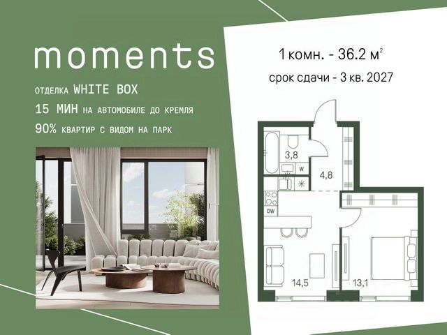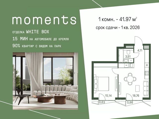 Цены указаны с условием 100% оплаты и стандартной ипотеки. Продается 1-к. квартира номер 50 общей площадью 44.5 кв.м. на 5-м этаже 30 этажного дома, корпус 2.1. С отделкой White Box. Moments — ЖК бизнес-класса, расположен на расстоянии вытянутой руки от старинного усадебного парка Покровское-Стрешнево. Moments — это единение города и природы, дом, который помогает обрести гармонию и баланс в жизни. Moments расположен на Волоколамском шоссе с удобным выездом в центр и в область, а также с расположенными в пешей доступности объектами транспортной инфраструктуры (МЦК и МЦД-2). Жилой комплекс будет состоять из 3 очередей — 8 корпусов высотой от 4 до 47 этажей. Здания будут расположены под разными углами для максимальной открытости солнцу и максимально роскошным видовым характеристикам. Внутренний двор: Иммерсивное благоустройство от британского бюро Gillespies и West8 сфокусировано на эмоциональном и чувственном опыте. Каждая прогулка по Moments погружает в путешествие со сменой сценариев и плавным потоком уникальных моментов. - Пешеходная экотропа,которая соединяет комплекс с парком Покровское-Стрешнево - Двор с фонтаном - Зеленые сады и лаунж-зоны - Пространства для пикников и общения - Зоны активного отдыха. Детские и спортивные площадки - Пешеходные тропы и велодорожки - Разнообразная коммерческая инфраструктура - Детский сад на 175 мест - Школа на 300 мест - Игровые площадки из натуральных материалов - Сенсорные сады - Безбарьерное зонирование Продается 1-комнатная квартира в ипотеку в районе Щукино в Москве.