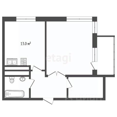 Жилая комната разделена на 2 части: гостиную-гардеробную и изолированную спальню-кабинет у окна. Удобно для семьи с ребенком и тех, кто работает из дома.