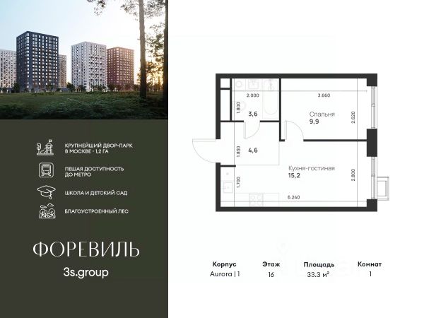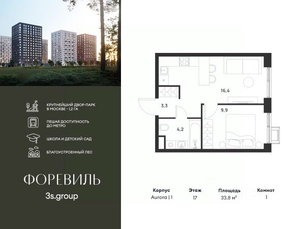 Пешая доступность от метро и московская прописка! Продается уютная 1-комн. квартира площадью 56,3 кв.м на 1 этаже 17 этажного жилого комплекса бизнес-класса Foreville от 3S Group. Общая площадь: 56,3 кв.м., жилая: 34 кв.м., площадь кухни-гостиной: 16,3 кв.м., высота потолков: 4,22 м., окна выходят во двор. Квартира предлагается без отделки, что идеально подходит для воплощения собственного дизайнерского решения. Также доступна опция предчистовой отделки, стоимость которой включается в общую цену квартиры. О проекте: Пространство Комплекс располагает крупнейшим приватным двор-парком в Новой Москве площадью 1,2 Га, предлагая жителям огромное пространство для отдыха, спорта и игр на свежем воздухе. Природный ландшафт Внутренний лесопарк с более чем 183 взрослыми деревьями и 10 320 цветущими кустарниками создает уникальную природную атмосферу для каждого времени года. Игровые и спортивные зоны Обширные площадки с безопасным покрытием, специализированные зоны для детей разных возрастных групп и взрослых, включая воркаут и настольный теннис, способствуют активному и здоровому образу жизни. Экологичность и долговечность Использование натуральных материалов, таких как лиственница, и крупноформатной бетонной плитки для покрытия, подчеркивает стремление проекта к экологичности и устойчивости. Безопасность и уединение Внутренний двор без машин обеспечивает безопасность для детей и спокойствие для взрослых. Территория огорожена и находится под круглосуточным видеонаблюдением. Сохранение времени Благодаря превосходной транспортной доступности и близости к новой станции метро Корниловская, Foreville позволяет жителям экономить время для семьи и отдыха на природе, минимизируя необходимость длительных поездок. Foreville не просто жилье, а целая экосистема для комфортной и гармоничной жизни на свежем воздухе, совмещая преимущества городской инфраструктуры и непосредственную близость к природе.