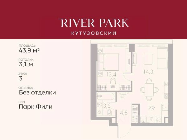 Продается 1-к квартира площадью 44.0 кв.м. на 3-м этаже в жилом комплексе премиум-класса River Park Кутузовский в Башне Lazur Tower О жилом комплексе. Премиальный жилой комплекс River Park Кутузовский строится в одном из самых престижных районов столицы Дорогомилово, на берегу Москвы-реки. Яркий проект в стиле эко-футуризма станет самым масштабным и самым высотным ЖК в локации Кутузовского проспекта. В проекте будет впервые воплощена концепция Family Premium. Расположение и Транспортная доступность: - На берегу Москвы-реки, напротив Москва-Сити - 600 метров до Кутузовского проспекта - Удобный съезд с ТТК - Прямой выезд на МКАД по Северному дублеру Кутузовского проспекта. - В пешей доступности 3 станции метро: Фили, Парк Победы, Кутузовская, а также станция МЦД Фили. Архитектура от именитого бюро ADM отличается уникальной пластикой фасадов - башни словно парят в воздухе, играя гранями как драгоценные камни. Жилой комплекс состоит из 5-ти небоскребов с home park на закрытой территории и внешней торговой галереей с открытым доступом. В закрытом внутреннем дворе уникальная по насыщенности клубная инфраструктура - 5 Towers Club только для жителей: - Многофункциональная спортивная площадка (баскетбол, футбол, воллейбол, большой теннис) - Детский игровой клуб NEMO - Life Rooms с караоке, барной стойкой и meeting room - Music salon - Gedonist Club с бильярдной - Beauty station - Гольф-симулятор Впервые в Москве lounge зоны на крыше небоскребов, только для жителей: - Всесезонные беседки иглу - Джакузи - Барная стойка - Грили - Площадка для занятий йогой - Самые высоки качели на крыше в России - Видовые площадки Благоустройство комплекса занимает 3 гектара и разработано мировым экспертом по городским парковым ландшафтам - голландским бюро WEST8. Концепция проекта дать жителям отдохнуть от городского ритма, расслабиться среди природы и натуральных материалов. В home park будут высажены многолетние деревья по принципу no allergy. - Зеркальный пруд с арт-объектом - Две детские площадки - Work out с навесом - Цветущий сад - Party lounge - Видовая зона отдыха с очагом - Солярий На территории жилого комплекса планируется строительство крупного образовательного центра: детский сад на 200 мест и школа на 460 мест.