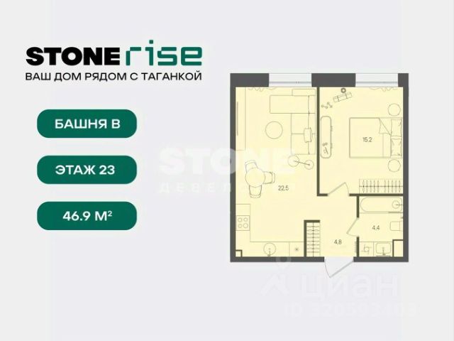 Старт продаж квартир в ЖК бизнес+ класса от девелопера STONE В продаже функциональная и светлая односпальная квартира с кухней-гостиной и одной спальней для реализации любого дизайн-решения, идеально подходящая молодым парам и небольшим семьям. Квартира расположена в камерном низкоэтажном жилом комплексе бизнес+ в одной станции от кольца. СТОУН Райз находится в уникальной точке с быстрым доступом ко всем ключевым локациям Москвы. Жилой комплекс располагается на границе Таганского района в одной станции от Кольцевой линии метро и в 8 минутах от Садового кольца. Близость к ЦАО обеспечивает выезды на основные магистрали. В 3 минутах от комплекса располагается новый ТПУ Серп Молот, которые объединяет 2 линии метро и МЦД. - 3 мин. м. "Римская", "Площадь Ильича" - 3 мин ТПУ "Серп и Молот", МЦД-2, МЦД-4 - 2 станции на метро до ГЭС-2 и Третьяковки, до Чистых прудов и Сретенского бульвара по салатовой - 10 минут пешком до набережной Яузы и 20 минут до трех разных парков. Архитектура Архитектурный проект разработан московским бюро WALL, известным работой над премиальными жилыми и офисными зданиями. Фасады домов выполнены из бетонной плитки серого и лого м изумрудного оттенков, а также металлических кассет. Вход в комплекс осуществляется через единое гранд-лобби. Здесь будут расположены кофейня, почты с локерами, а также комфортная гостиная с мягкой мебелью. В каждом корпусе расположены лаунж-зоны с естественным освещением в зоне лифтов. Благоустройство Территория комплекса полностью закрыта для машин и случайных посетителей. В центре - прогулочная аллея с дизайнерским освещением и местами для отдыха. В комплексе также обустроена площадка для выгула собак. Маршруты движения внутри двора продуманы для удобства пеших прогулок. Инфраструктура жилого комплекса На первых этажах комплекса расположены кафе, магазины, фитнес-студия и другие сервисные объекты. Двухуровневый подземный паркинг с возможностью выбора стандартных, увеличенных или семейных мест. Для удобства жителей предусмотрены лапомойки, келлеры, места для временного хранения велосипедов и самокатов. В СТОУН Райз также спроектировано многоуровневое пространство для жителей: - Бизнес-гостиная и детская-игровая, многофункциональное цифровое пространство - Благоустроенная общественная терраса с панорамными видами STONE - девелопер коммерческой и жилой недвижимости классов бизнес и премиум в Москве с 19-летним опытом. С 2022 года занимает лидирующую позицию на офисном рынке (рейтинг РБК). Сегодня в портфеле девелопера представлено 3 млн кв. м построенных, строящихся и проектируемых объектов, из которых более 1 млн кв. м находятся в стадии строительства. Компания имеет самый масштабный проектный портфель офисной недвижимости класса А на московском рынке (данные NF Group) и возглавляет топ-6 устойчивых девелоперов согласно исследованию F Research от Forbes. В 2023 году частью стратегии по развитию компании стала диверсификация портфеля, в результате которой девелопер провел ребрендинг и запусти